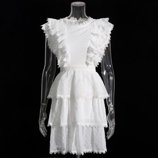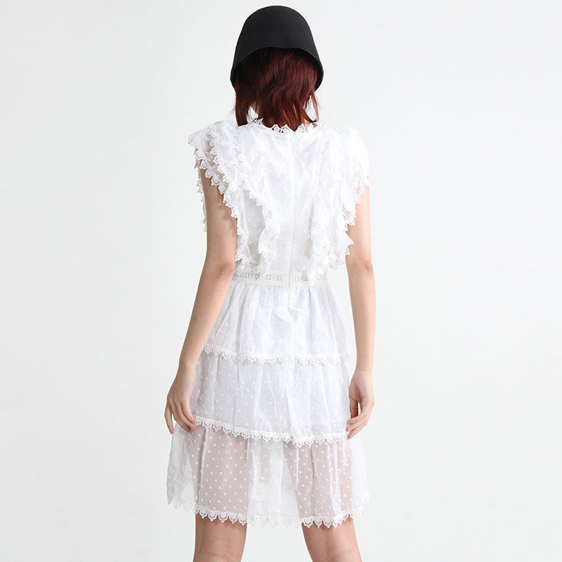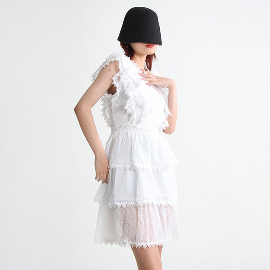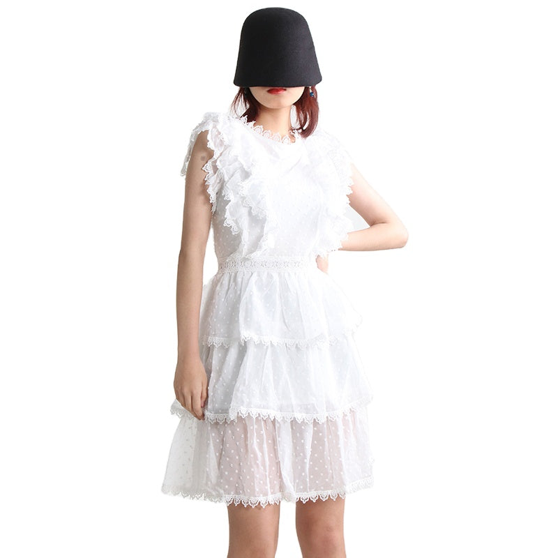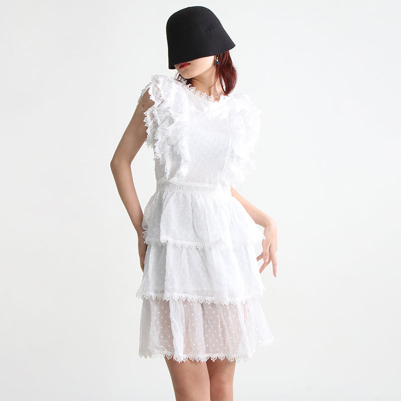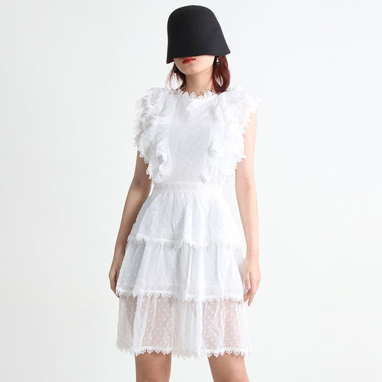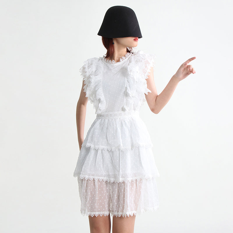 CHICEVER Mesh Dress Spliced Lace Trim Layered Ruffles Polka Dots Sleeveless Women'S Dresses 2023