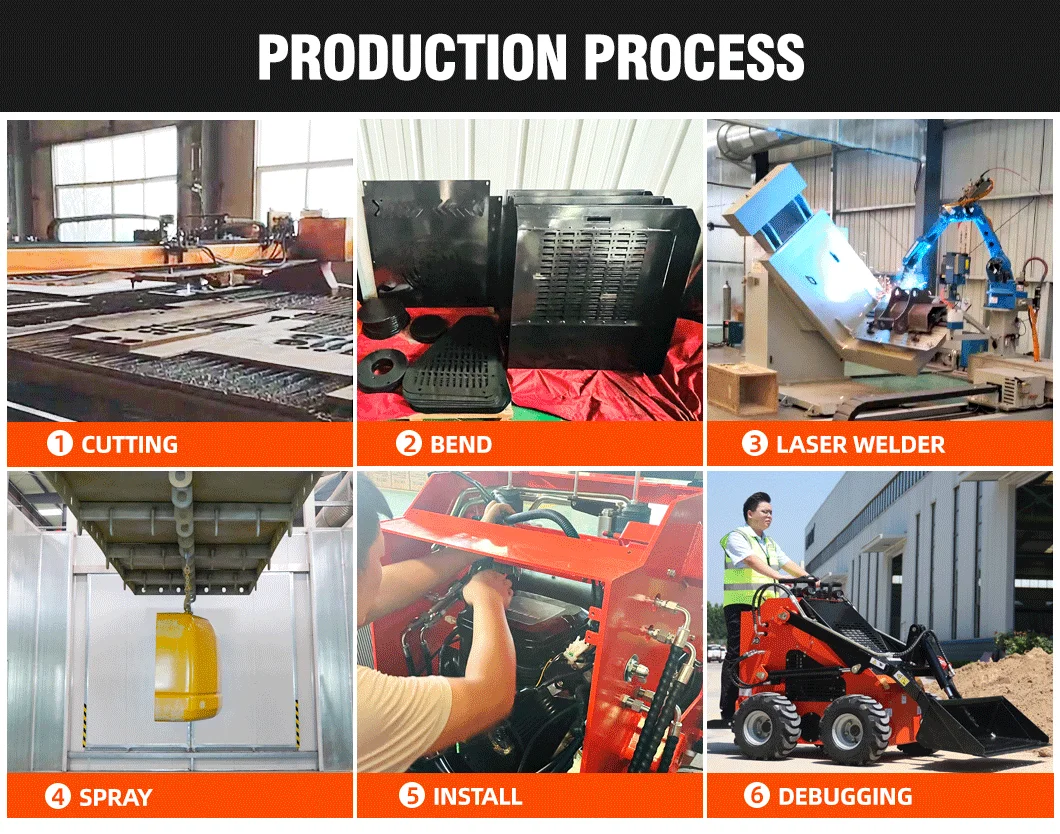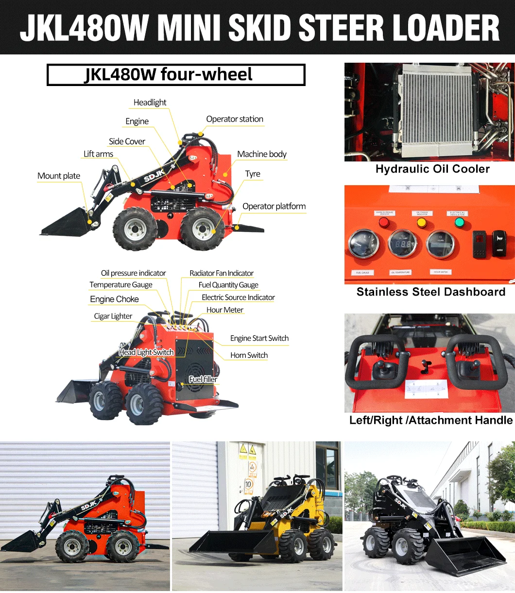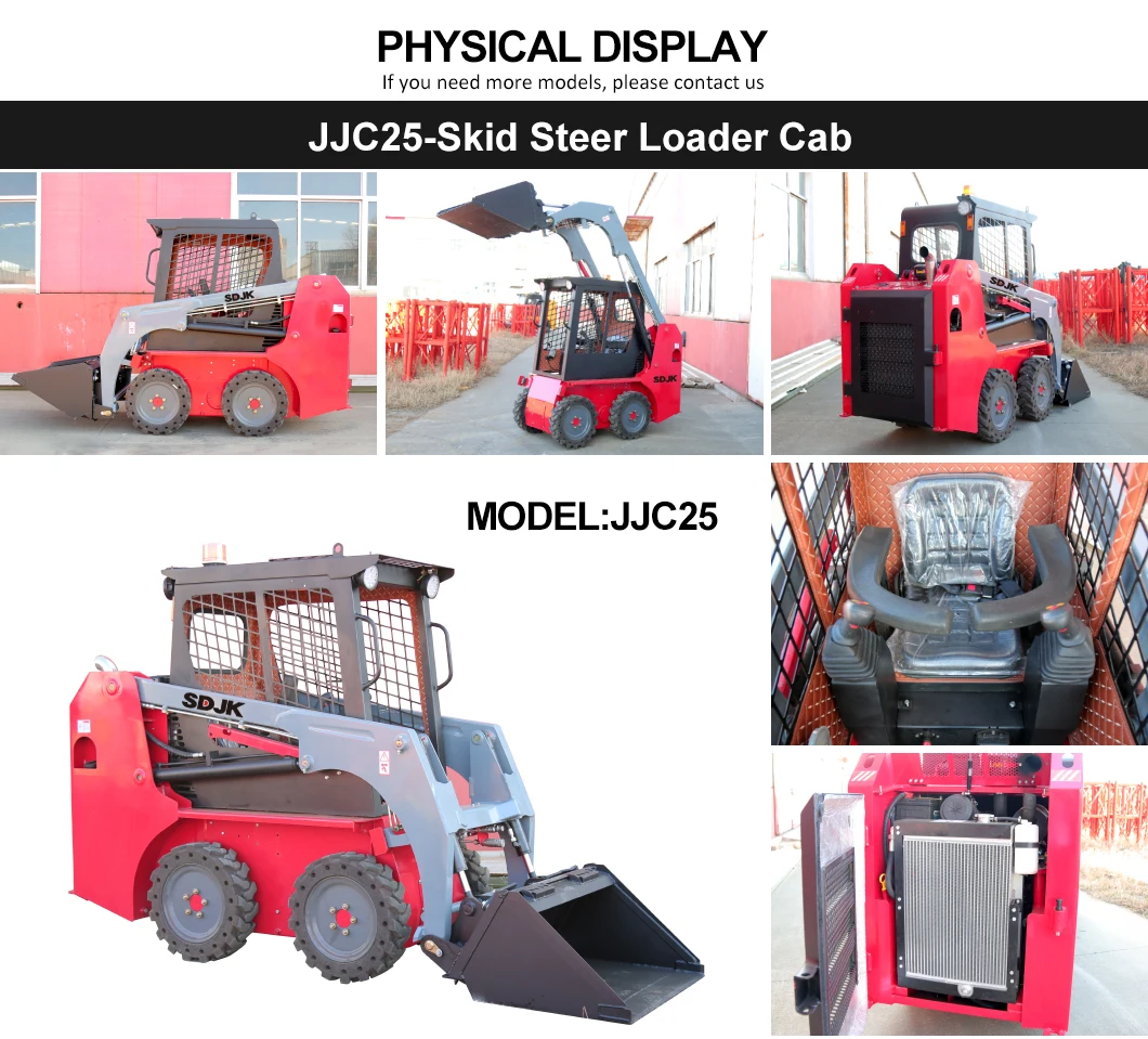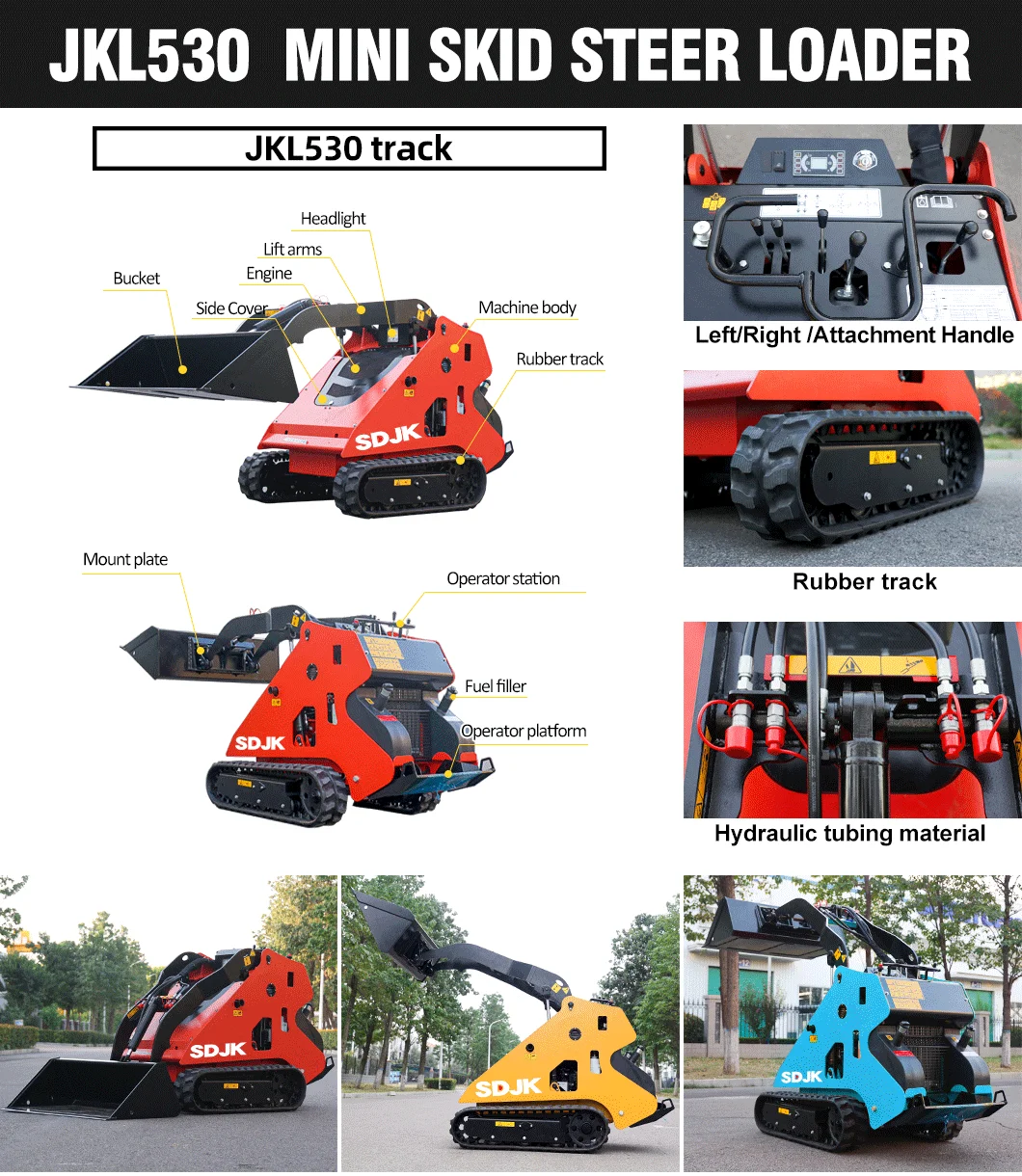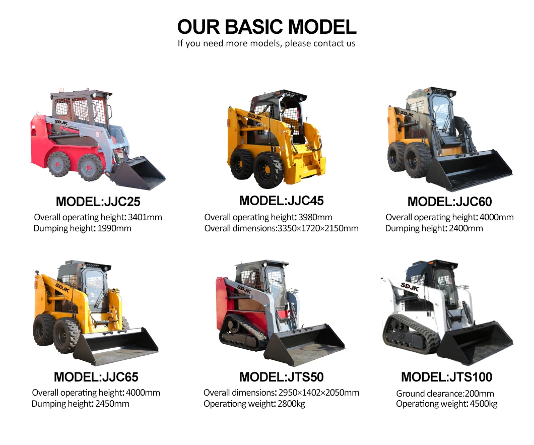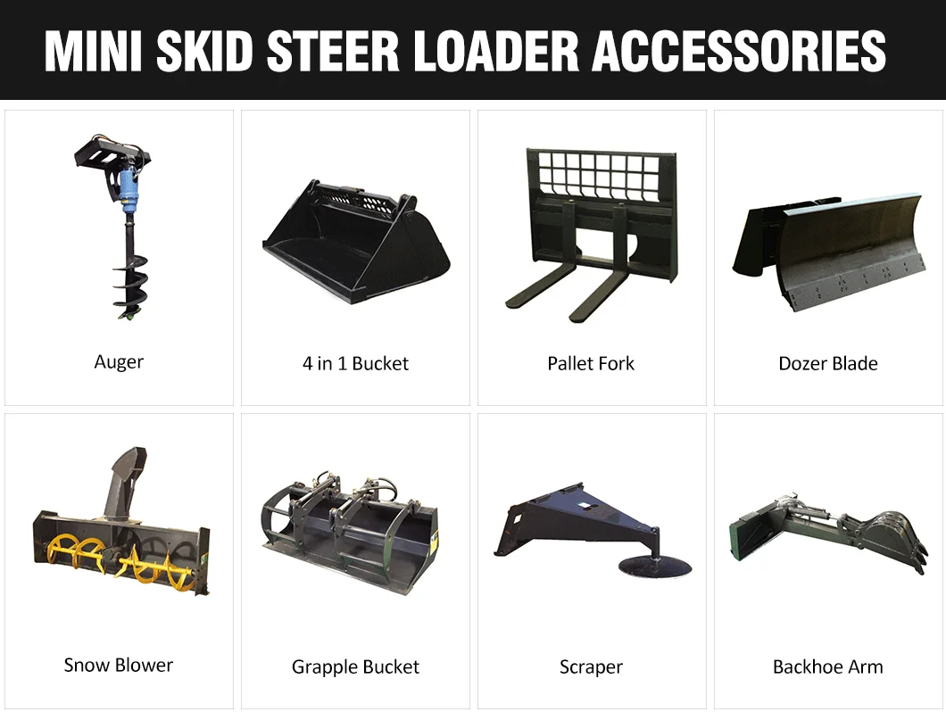 Skid steers, and Mini skid steers with their compact size, maneuverability, and ability to easily switch among a huge range of different attachments makes them an invaluable tool. The skid steer loader consists of a rigid frame with lift arms that are used to attach a wide variety of attachments for a variety of different jobs. Strong/Compact/Maneuverable/Compact profile design, makes this a great perform er for its size and the tight, It's perfect for a variety of applications such as construction, landscaping, excavating, fertilizer plants, foundries and much more. Also, The versatile quick-tach system similar with BOBCAT or other brands, provides fast, secure attachment changes.