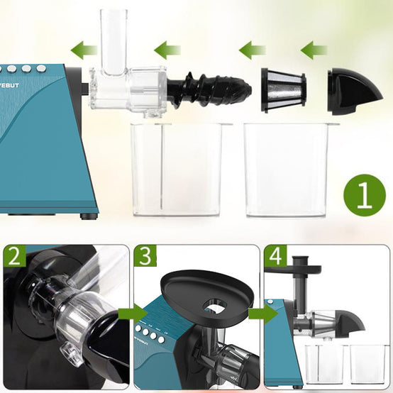 - Simple From Start to Finish: Just push, rotate and lock the corresponding components, you can easily assemble a useful juice machine. Plug in the main power, place cleaned and properly cut fruits and veggies in the hopper, the auger begins juicing and you get tasteful juice. It has reverse function to avoid jamming. After use, unlock, rotate and pull out the components, you can wash them in the sink or dishwasher. A cleaning brush is provided to make the juicer cleaning easier.