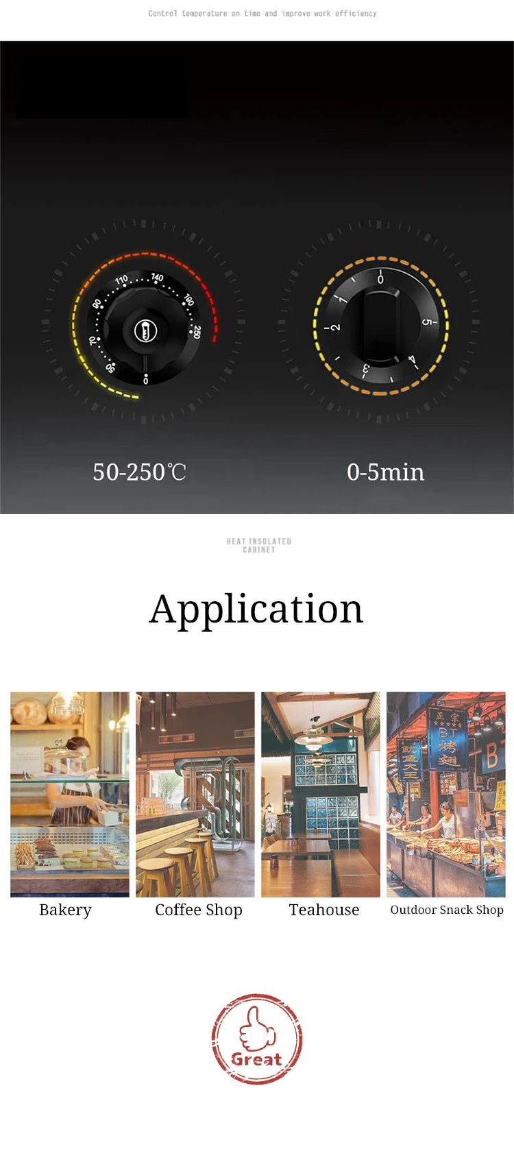 Used for street snacks, bakery, pastry making in refreshment stores, etc. The machine adopts thickened Teflon coating and thickened heating tube, which will not stick to the pan and heats up quickly. Good helper for small business.