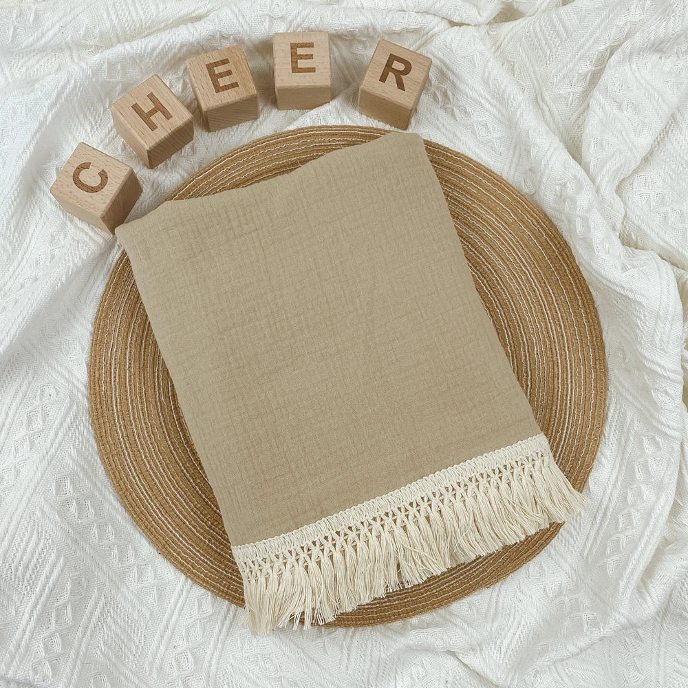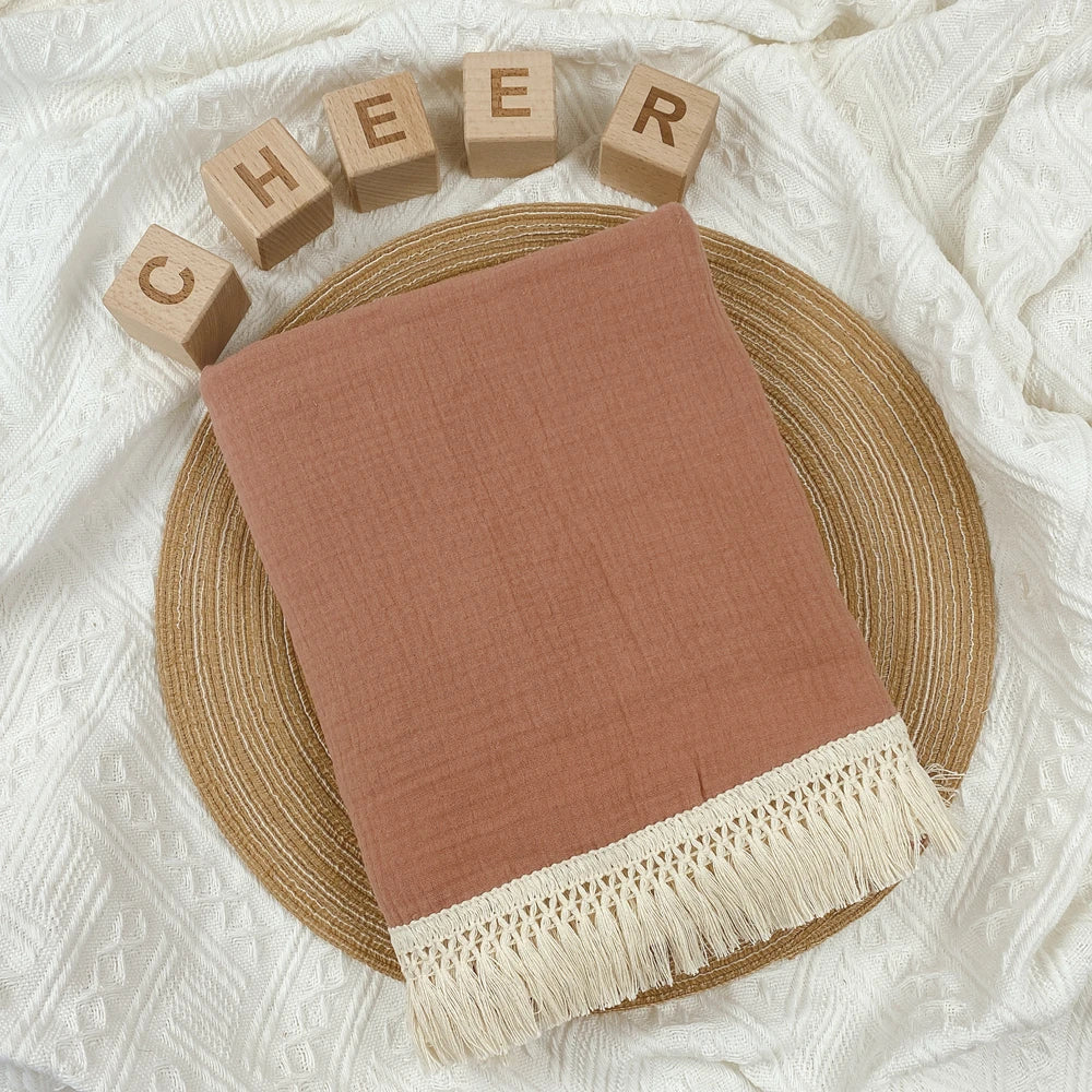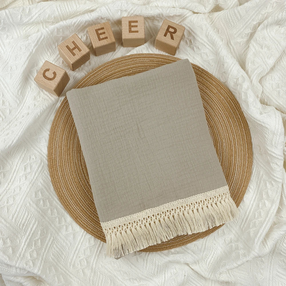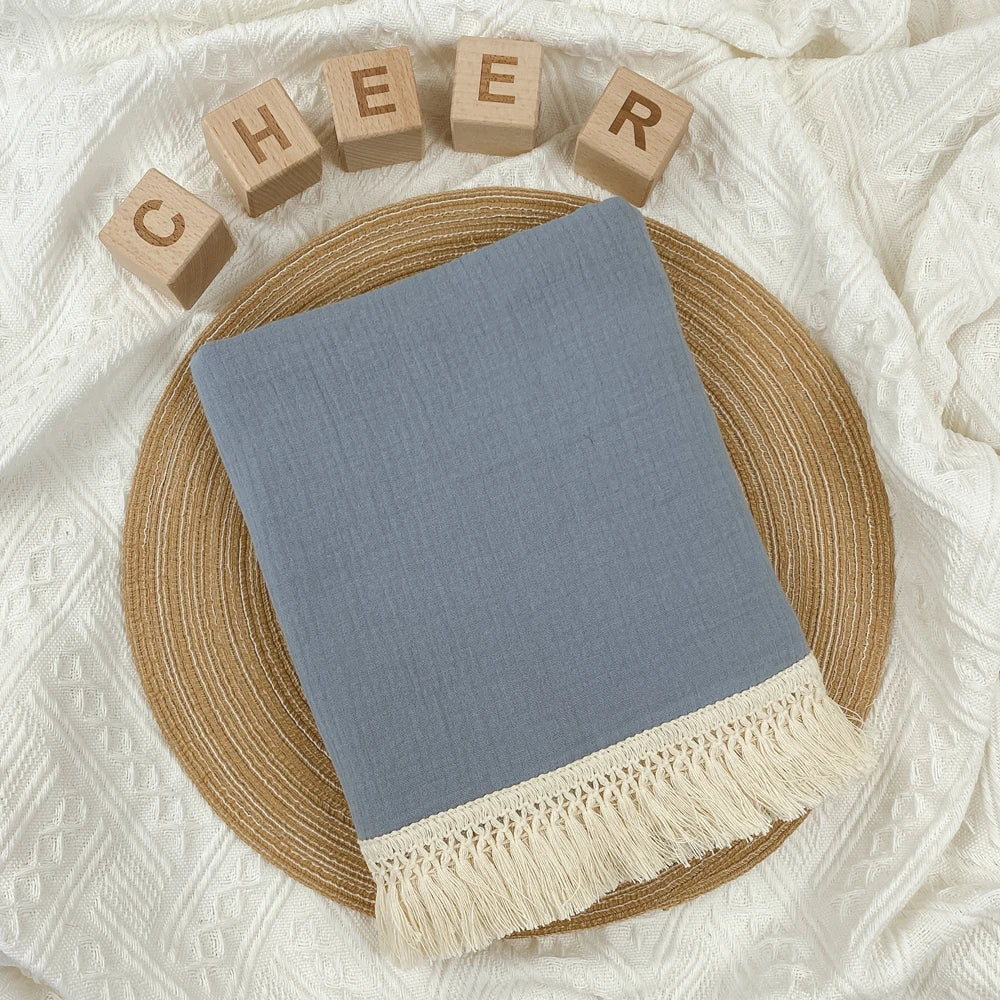Custom Print Muslin Cotton Swaddle Fringe Tassel Newborn Swaddle Wrap Sleeping Quilt Baby Blanket