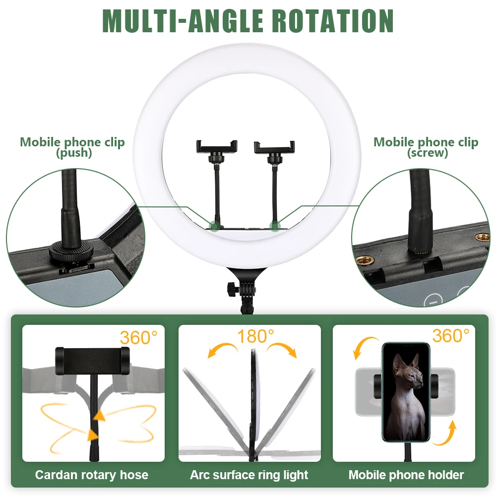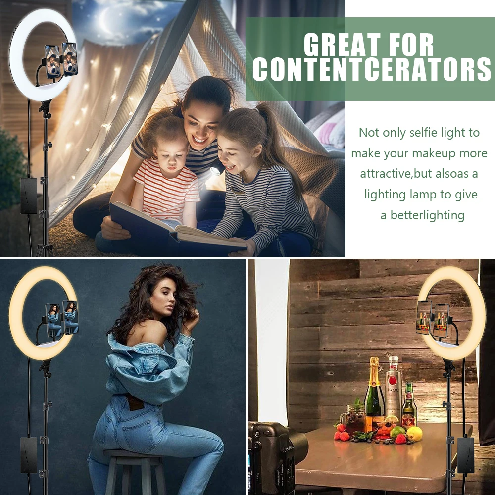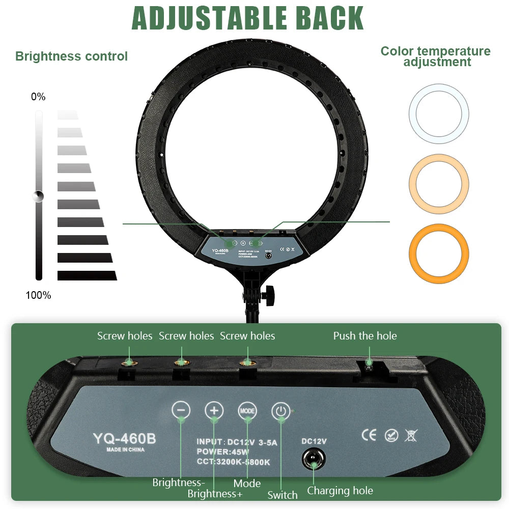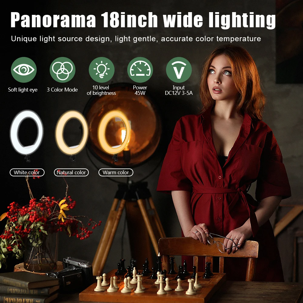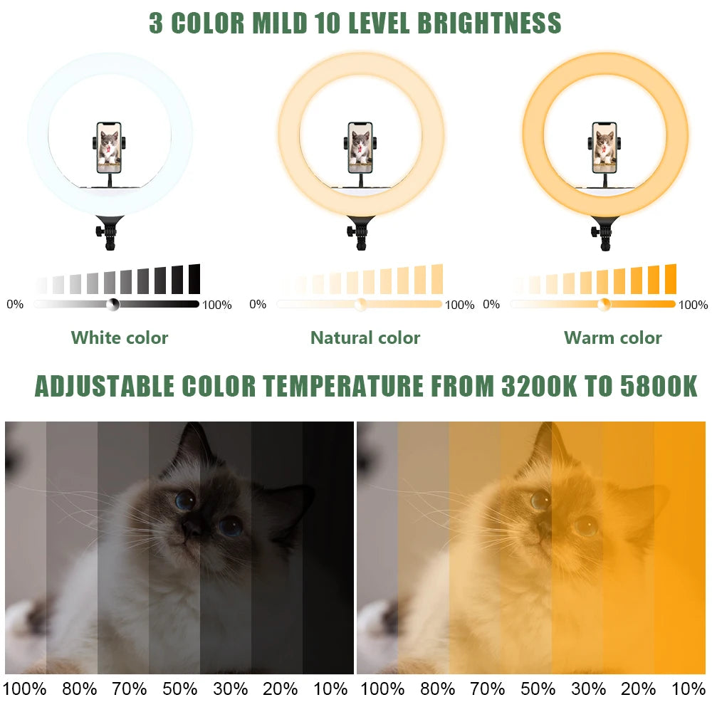 This ring light provides a professional-quality, soft, nearly shadowless and clean spread of light emitting, with 3 colors