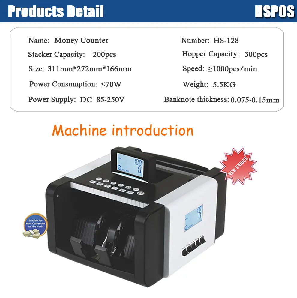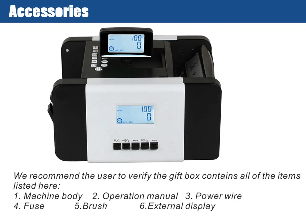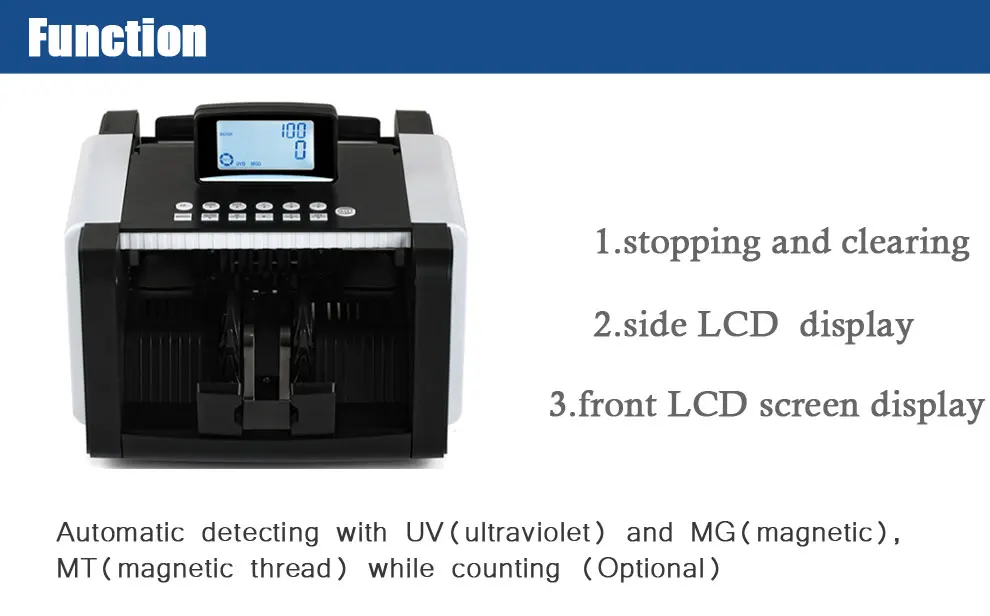 ◆Automatic detecting with UV(ultraviolet) and MG(magnetic), MT(magnetic thread) while counting (Optional). ◆With front LCD screen display +side LCD display ◆With “AUTO”&”MANUAL” function. ◆With “SIZE” detection function. ◆Automatic starting, stopping and clearing. ◆With batching, adding and self-examination functions. ◆Automatic half-note and chain-note detections. ◆Double-notes detecting. ◆With front and side double control panel ◆With external display