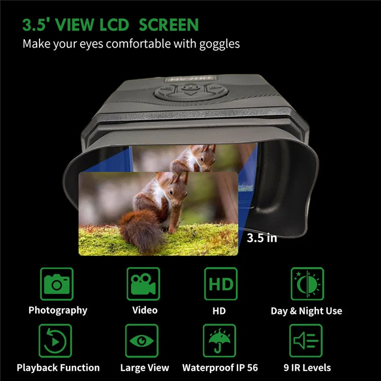 This Night vision goggles built-in 3.5inl TFT LCD screen. The night vision binoculars combines an excellent fully multi-coated all-optical system with a video camera, allowing quickly capture the perfect photo or high definition video (image quality 3200X1800).