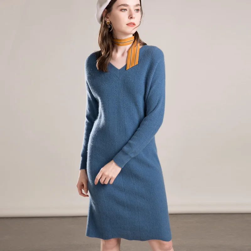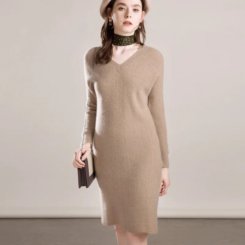 Fashion Office Cashmere Sweater Dress Women Lady V Neck Korean style Knitted Dress for Winter