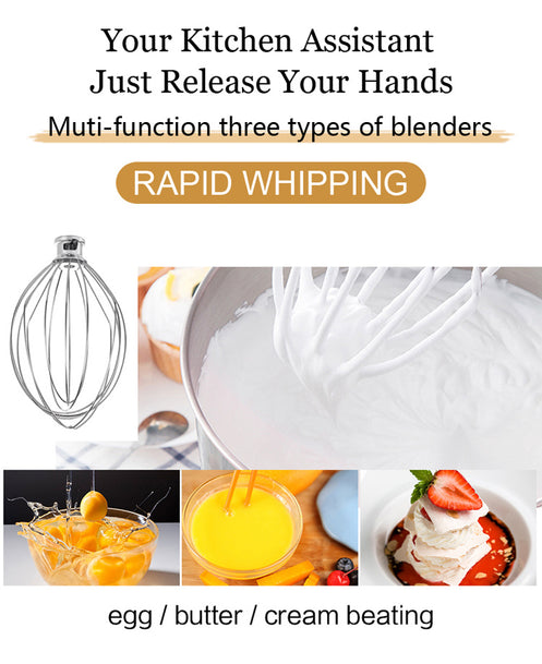 3 in 1 mixer attachments, includ egg whisk, dough hook, and flat paddle