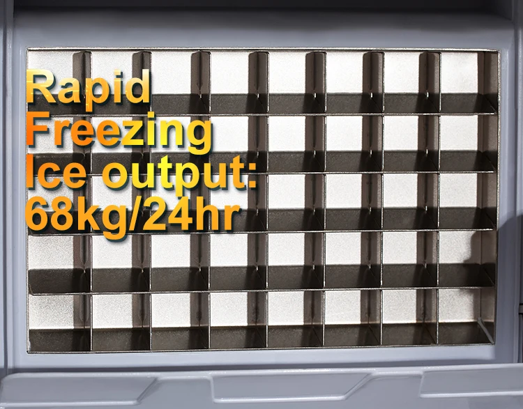 8*18 ice cube tray produces 144 cubes for one cycle within only 12-18 minutes and up to 150 lb in 24 hours. Heat insulation function prevents ice cubes from melting for 5-7 hours even through black out, brings you convenience and efficiency.Stainless Steel+ABS Ice maker machine 68kg commercial cube ice machine portable ice maker