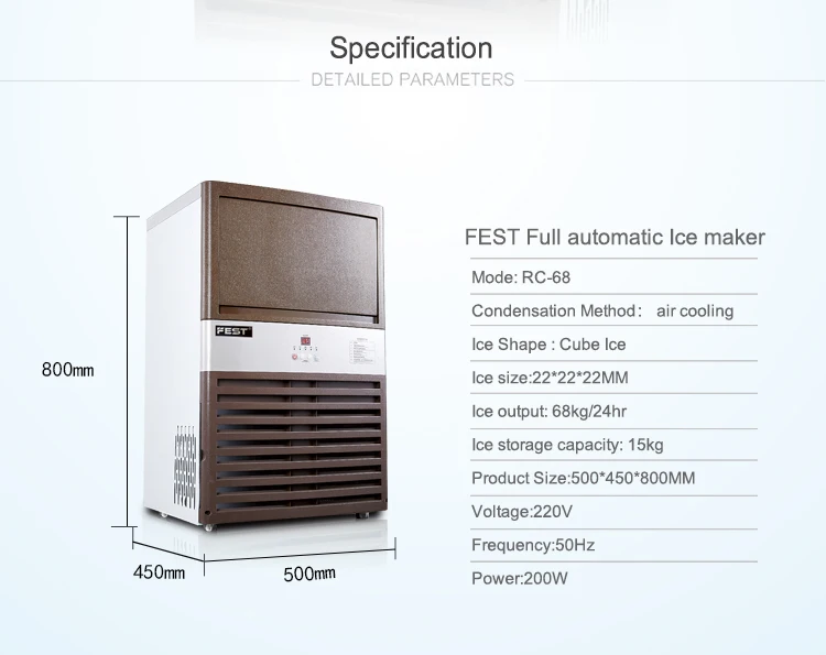 Automatic electric cube block ice maker machine Mode: RC-68 Voltage: 220V/50Hz Power:480 watts, electric, high efficiency Ice output: 150lbs(68kg)/24hr,high speed Ice storage capacity: 33 lb(15 kg), big enough Product Size: 500*450*800mm ice size: 22*22*22mm, most popular