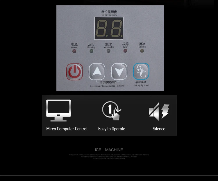 Tangibly buttons of POWER, RUNNING MODE ADJUSTMENT, CLEAN/SET, ICE THICKNESS/DUTY TIME ADJUSTMENT and ILLUMINATION. Auto-detection reveals operation problems and offer alarm when ice is full. Consice and precise.