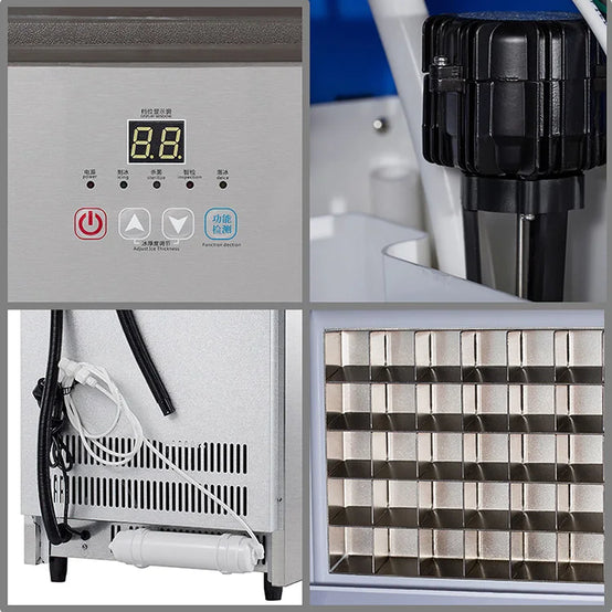 Tangibly buttons of POWER, RUNNING MODE ADJUSTMENT, CLEAN/SET, ICE THICKNESS/DUTY TIME ADJUSTMENT and ILLUMINATION. Auto-detection reveals operation problems and offer alarm when ice is full. Consice and precise.