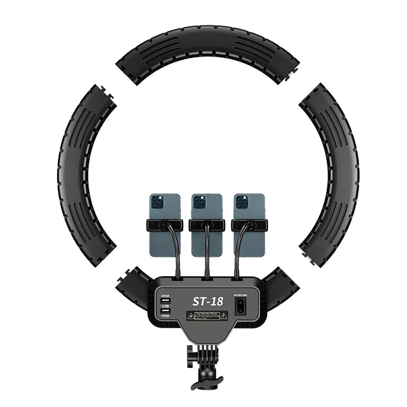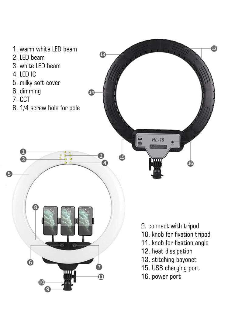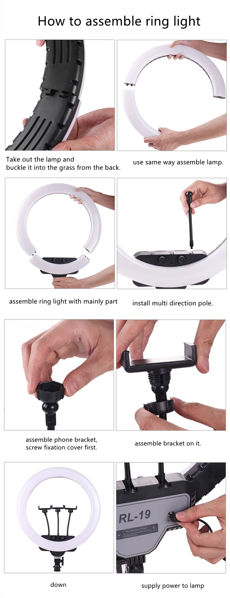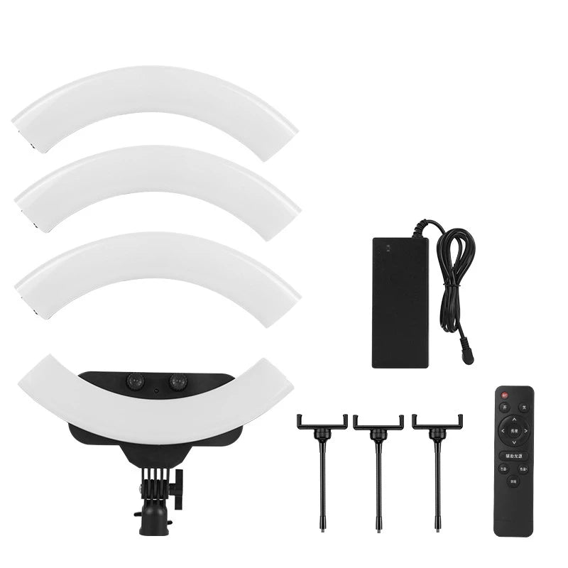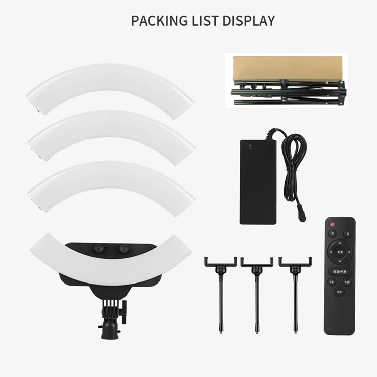 ring light*1,phone bracket*3, 2m light tripod*1, 2m power cable*1,wireless remote*1