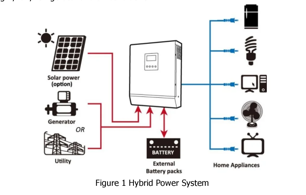 The following illustration shows basic application for this inverter/charger. It also includes following devices to have a complete running system: