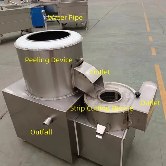 Potato cleaning, peeling and slicing 3-in-1 machine, can slice, shred, and cut into strips. One person operation, saving time and effort.
