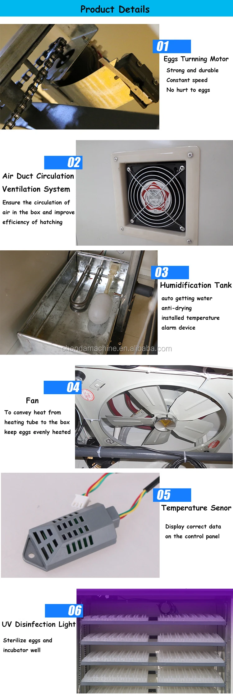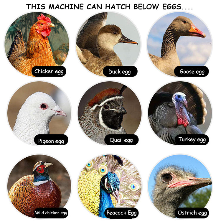 4. Timing automatic egg-turning control. 5.Automatic ventilation and humidity control.