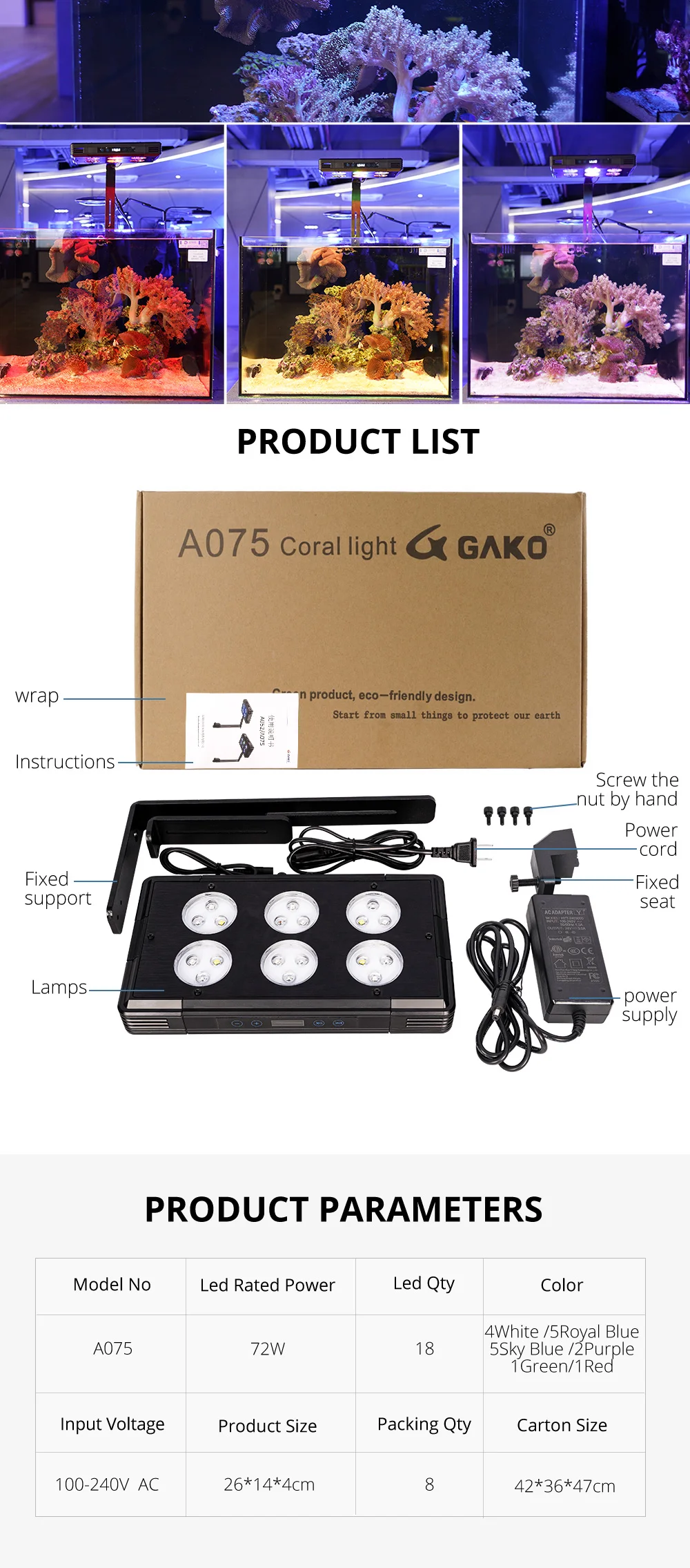 GAKO A075 75W Led Saltwater Aquarium Lighting, Sunrise Sunset Aluminum Touch Control Marine Lights for Coral Reef Fish Tank