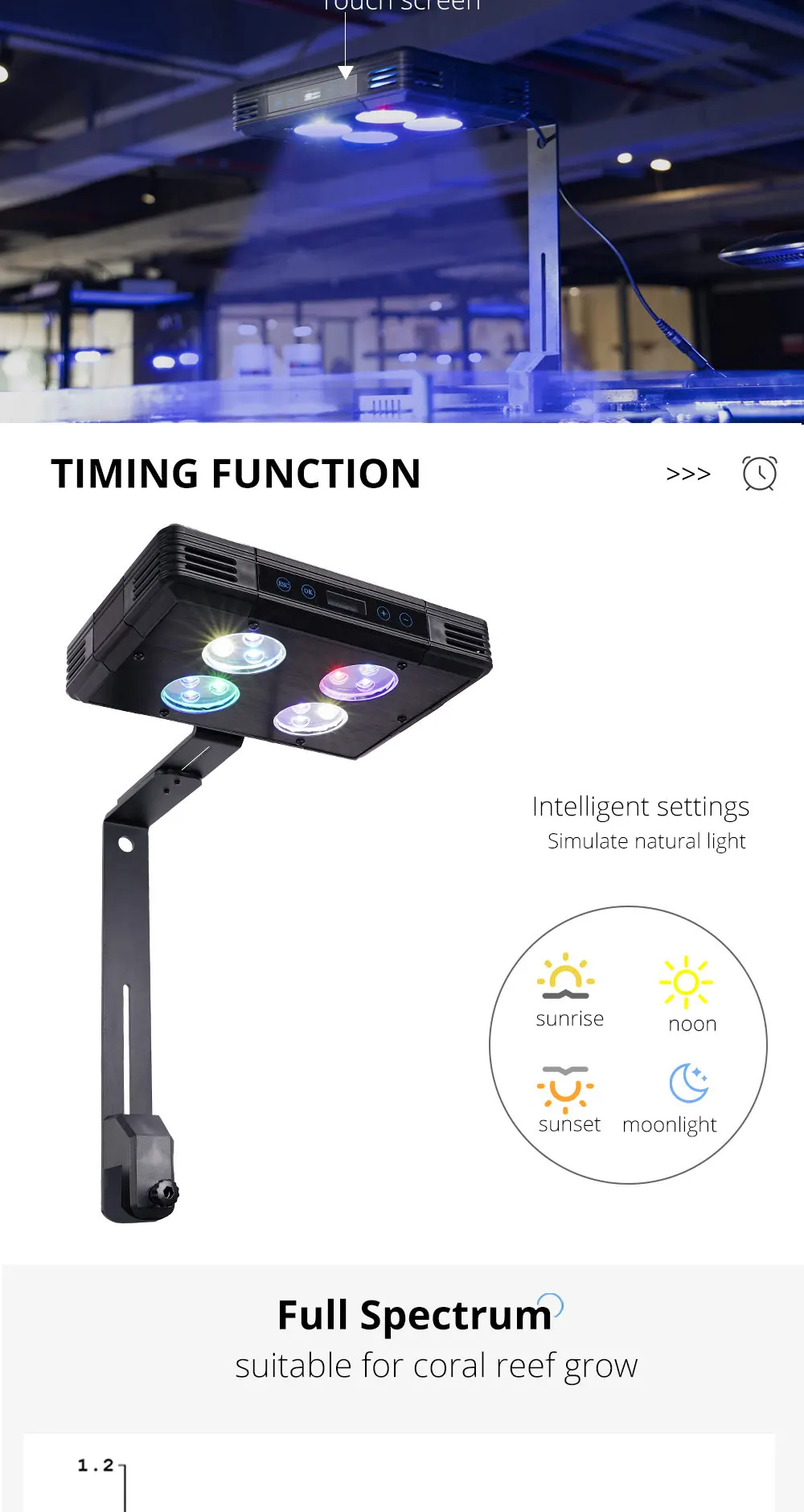 It has 4 functions of simulating natural light ( sunrise, noon, sunset and moonlight). The touch screen control operation is