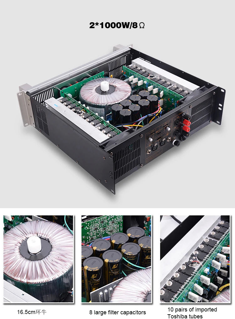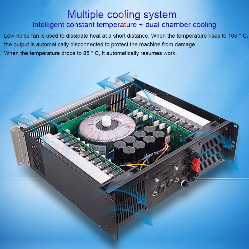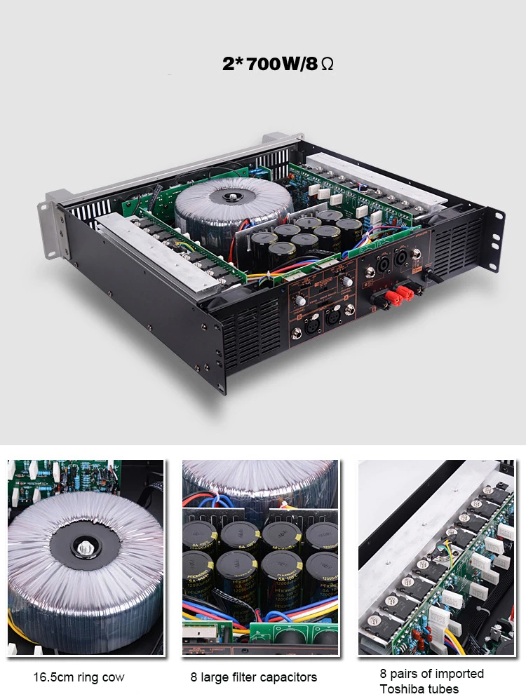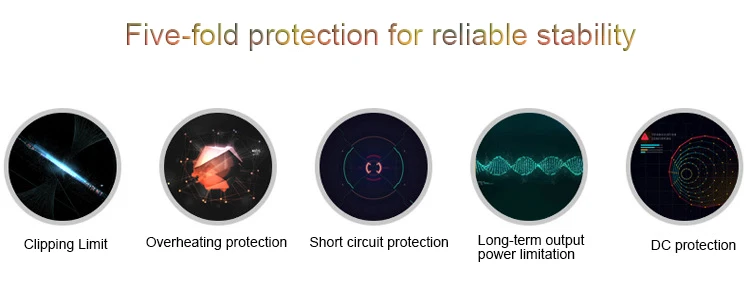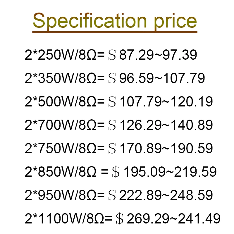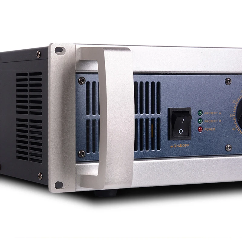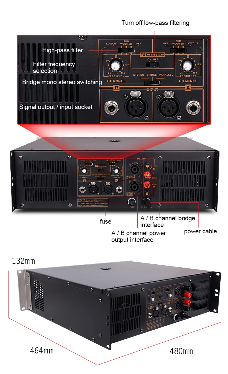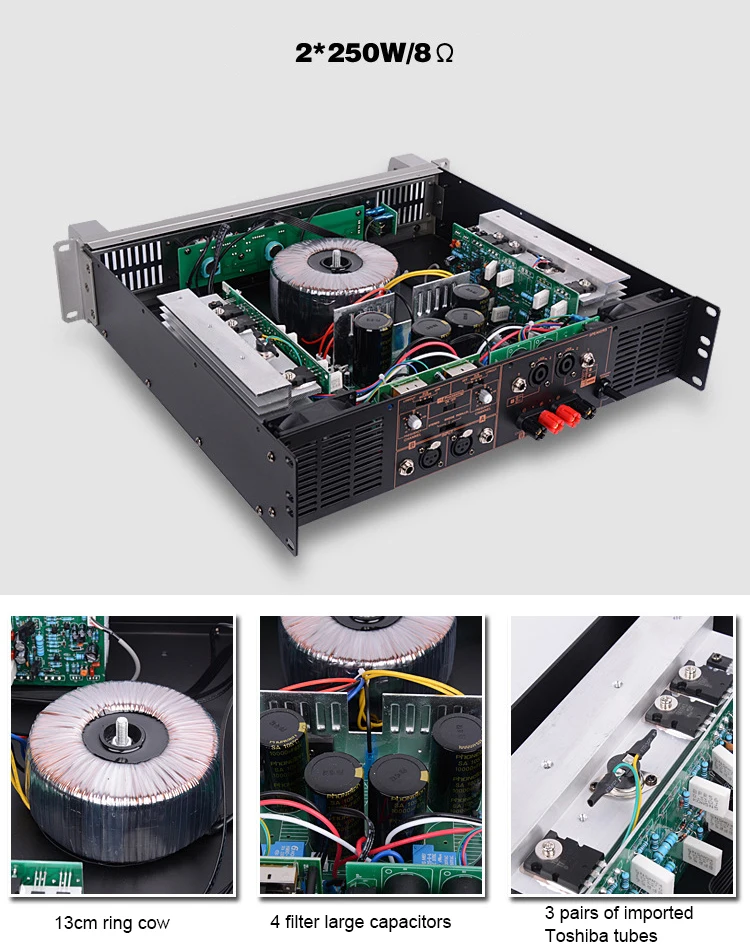 Technical Parameters Total harmonic distortion: 0.01% Signal to noise ratio:> 105dB Input impedance: balanced 20kΩ / unbalanced 10kΩ Input sensitivity: 0db / 1V Voltage gain: adjustable, maximum 32dB (40 times) Frequency response: 20Hz ~ 20KHz ± 0.15dB Conversion rate: 50V / us Channel isolation: 105dB (1KHz); 80dB (20KHz) Damping coefficient: 8Ω / 1KHz 250 Connector: Input XLR, TRS Indicator light: signal indication, protection indication, overheating protection, overload protection AC input voltage: AC220V / 50 ~ 60Hz
