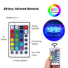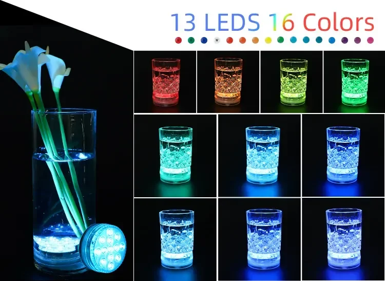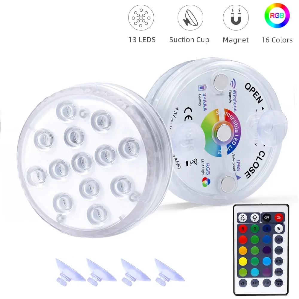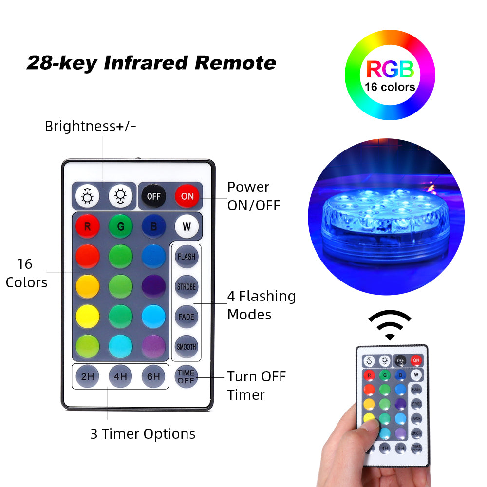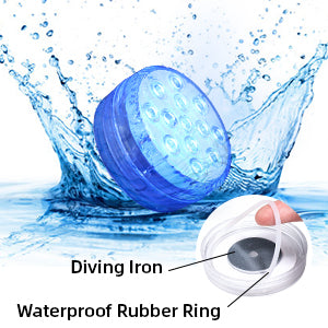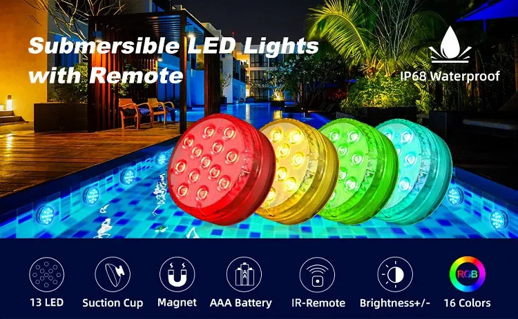 Our led pool lights are made of high-quality ABS material. There are 3 battery slots and 13 LED lights inside the led underwater lights. The shell contains a waterproof ring, which can better prevent water from entering the waterproof underwater lights. There are 3 magnets and 2 suction cups outside the shell of the waterproof underwater lights, which can make the led pool lights better adsorb on the iron rod or the pool wall. Suction cups are replaceable. This led underwater lights have 16 colors and 4 light flashing modes. This submersible LED light comes with a 28-button remote control. The led pool lights can change color, light flashing mode, and light intensity through the remote control.