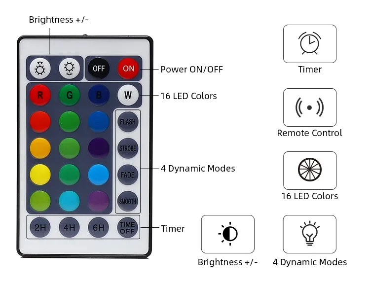 16 LED Color, 4 Dynamic Effects, Dimmer,Timer(2H,4H,6H)