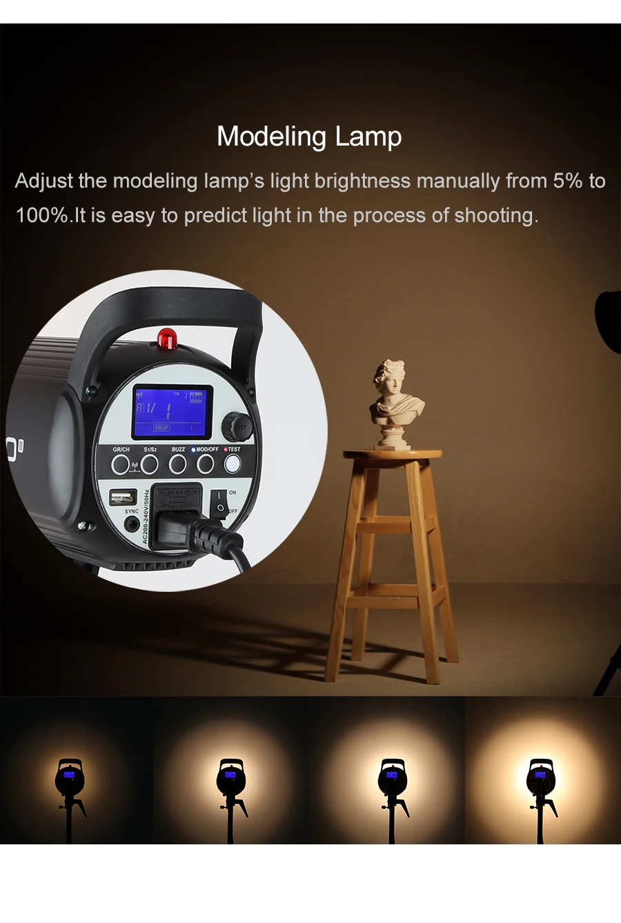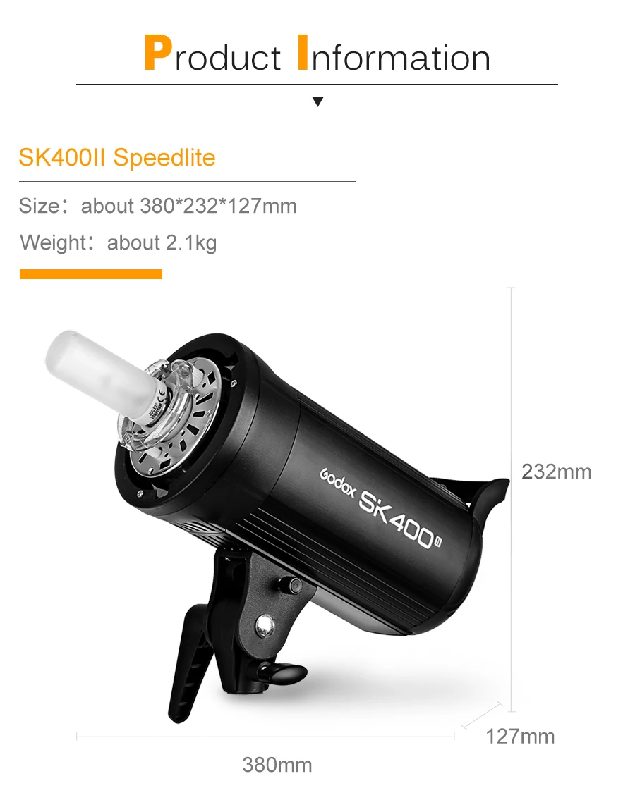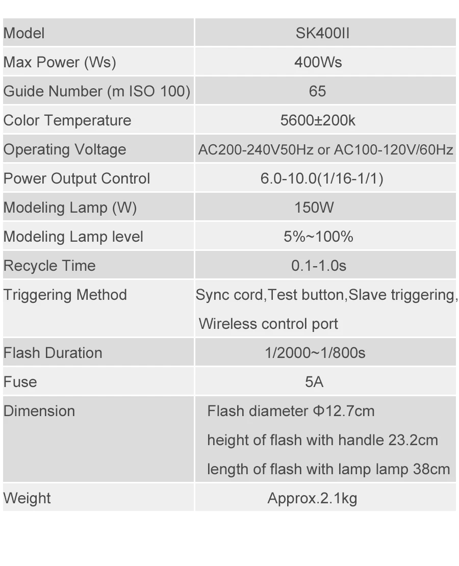 Specifications: Model: SK400II Max. power: 400Ws Guide No.(m ISO 100): 65 Color temperature: 5600+/-200k Power output control: OFF, 1.0~3.0?1/8-1/1) Modeling lamp: 150W Modeling lamp level: 9 levels(L1 to L9) Rycle time: 0.1-1s Triggering method: Sync cord, test button, slave triggering, wireless control port Flash duration: 1/2000 to 1/8000s Fuse: 5A Package size: 44 * 27 * 21.5cm / 17.3 * 10.6 * 8.5in Package weight: 2871g / 6.33LB