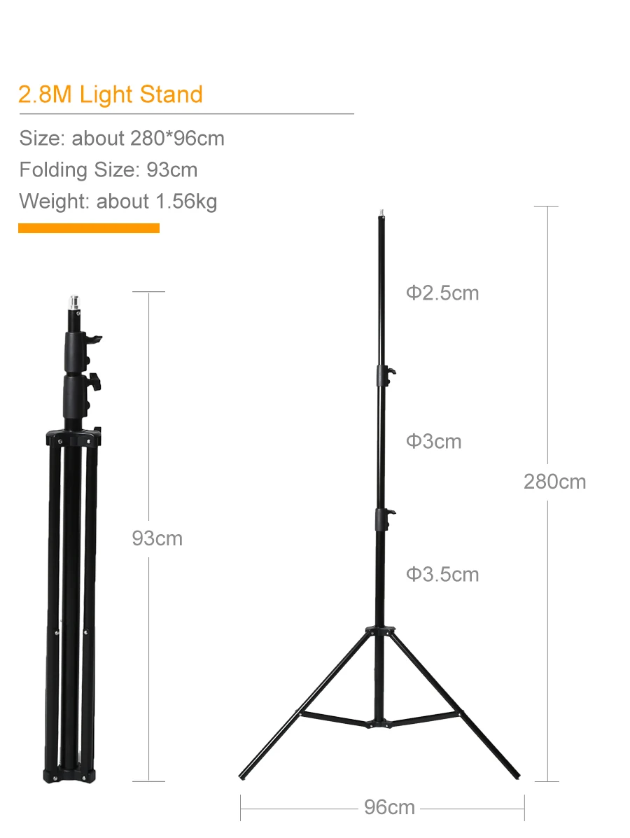 Model:Godox 2.8m Light Stand x1 Features: This light stand is constructed from metal and has a three stage adjustable shaft and rubber feet, giving it exceptional strength for heavy duty work. Its solid locking capabilities ensure the safety of your lighting equipment when in use. This light stand has a maximum height of 280cm. This stand supports all major photo equipment including reflectors, softboxes, lights, umbrellas, backgrounds and more. Specification: Type: Photography tripod stand Color: Black Material: Aluminum Locking Collar & steel tubes Sections: 3 Max. tube diameter: 35mm Max. load: 9kg / 19.8lb Max. height: 280cm / 9ft Folded height: 94cm / 3.ft Package size: 98 * 9 * 9cm / 40 * 3.5 * 3.5in Package weight: 1480g /