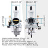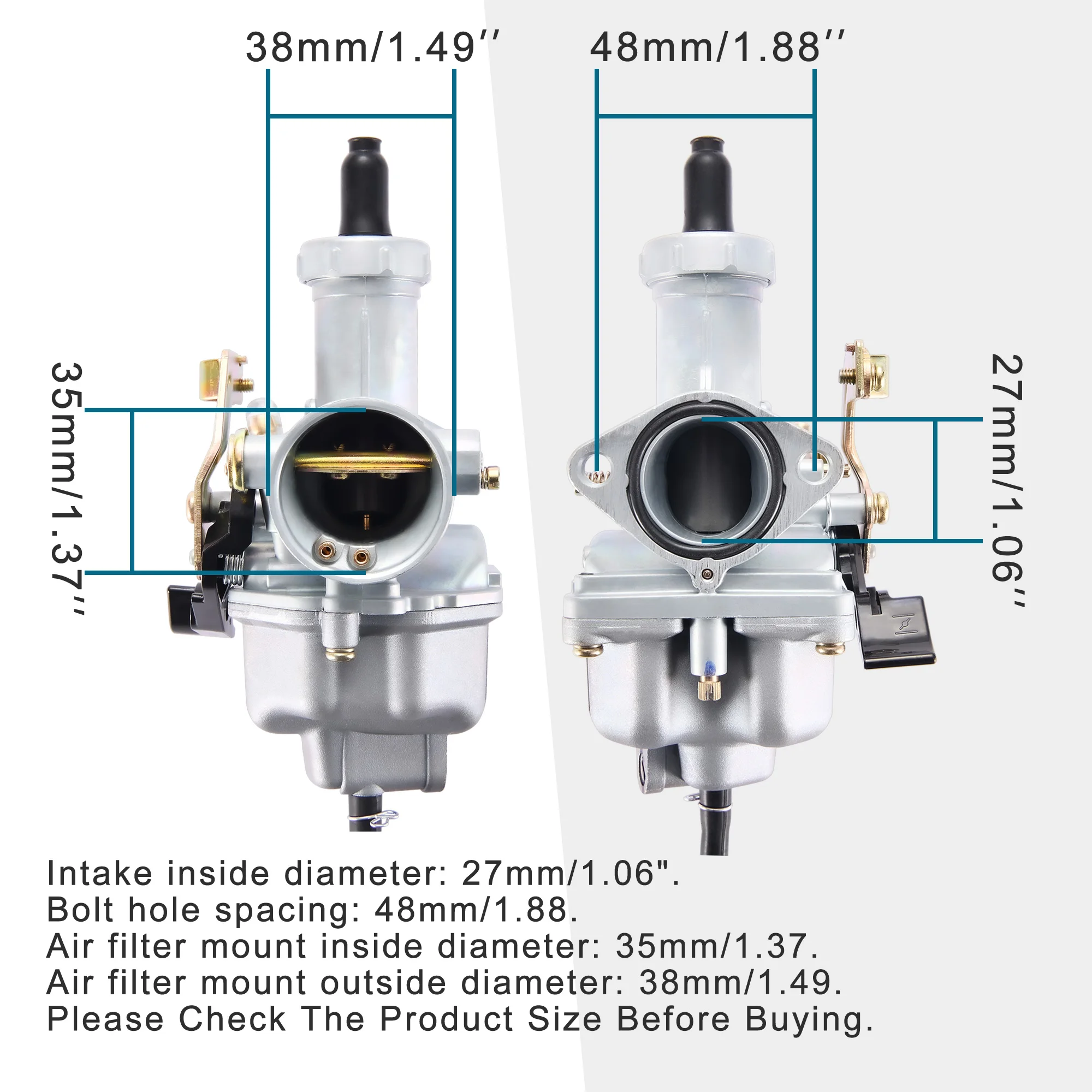 Intake inside diameter: 27mm,Air Intake Diameter: 35mm,Mounting Holes Distance centered: 48mm (Detailed measurement as shown in the pictures)