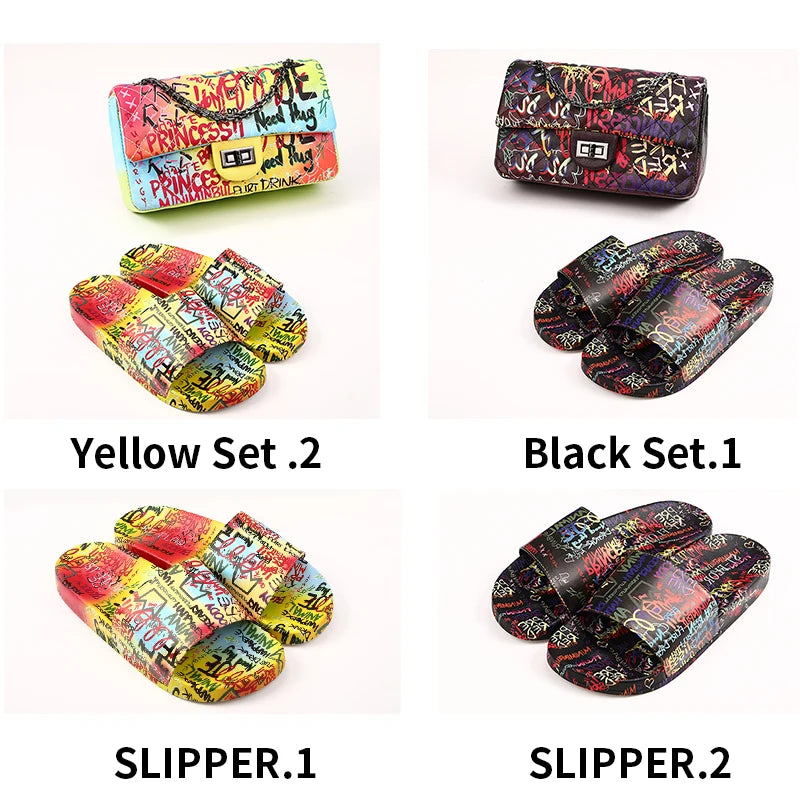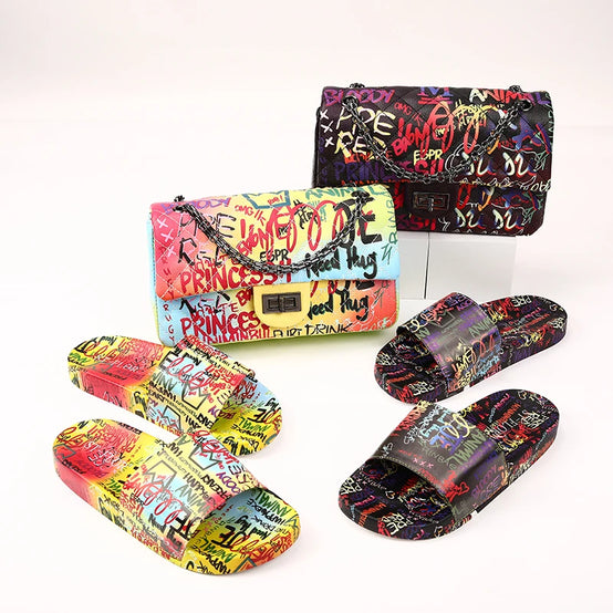 graffiti bags 2021 new arrivals ladies fashion matching bags set women purses shoes sandals handbag purse and slides set