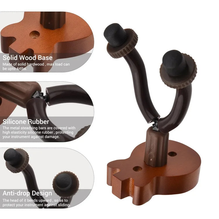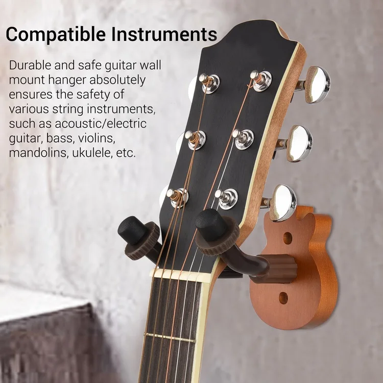 Features: The guitar wall mount hanger is made of solid hardwood with sturdy iron and silicone rubber. It is not synthetic wood, but a whole piece of solid wood. Can load max. 44lbs and protect guitar from scratches. The solid wood wall mount base makes it mounted sturdy and easily without leading any wob. Durable & safe guitar wall mount hanger absolutely ensures the safety of various string instruments, such as acoustic/electric guitar, bass, violins, mandolins, ukulele, etc. The guitar wall mount hanger can rotate to any desired angle to accommodate non-symmetrical headstocks, and adjust it to fit each musical instrument precisely. You don't have to worry about your guitar size. The guitar hanger is lightweight, flexible and stable, very easy to install. The metal steadying bars are covered with high elasticity silicone rubber, protecting your instrument against damage. The head of it bends upward, so as to protect your instrument against sliding under the worst possible conditions.