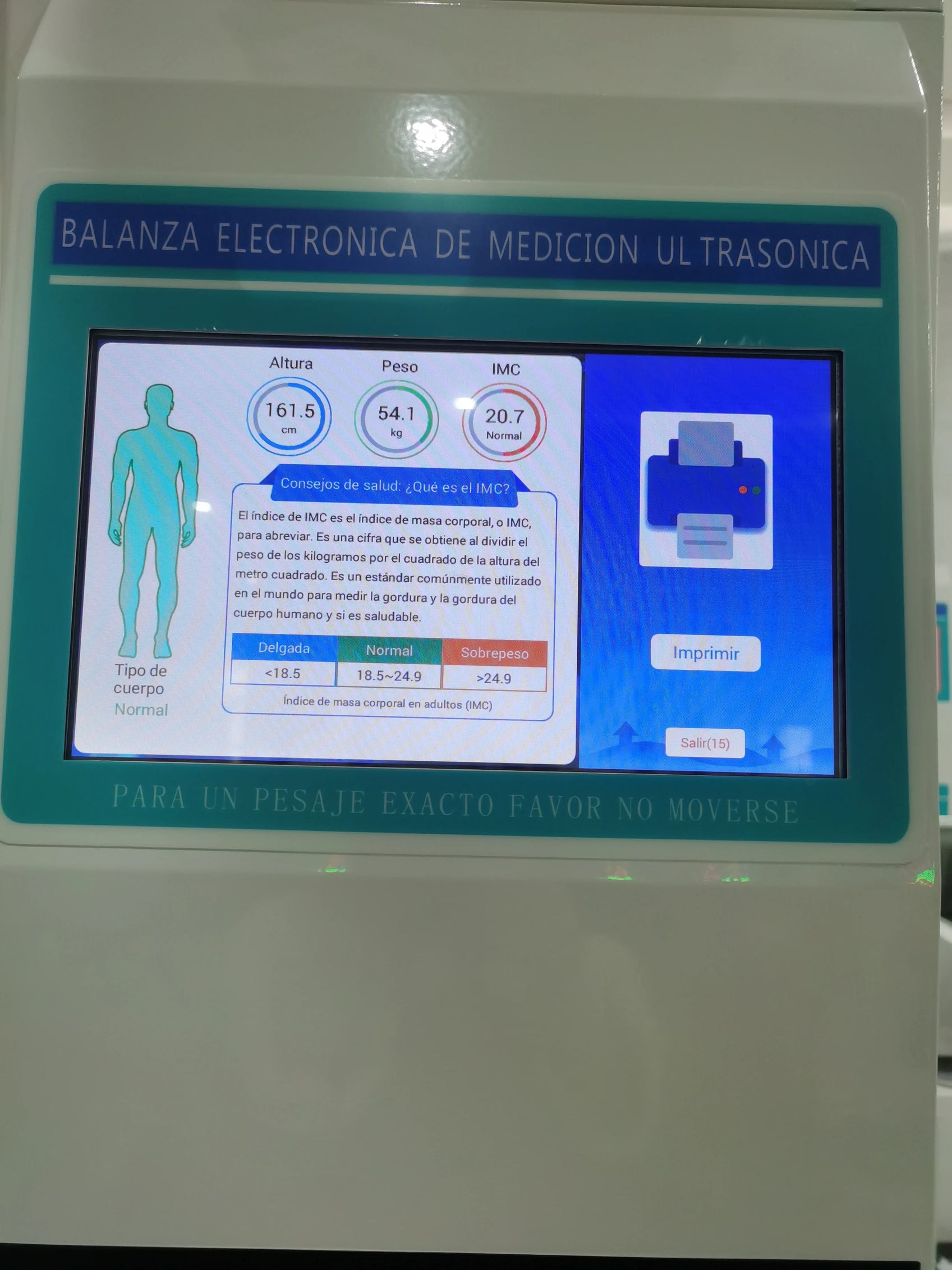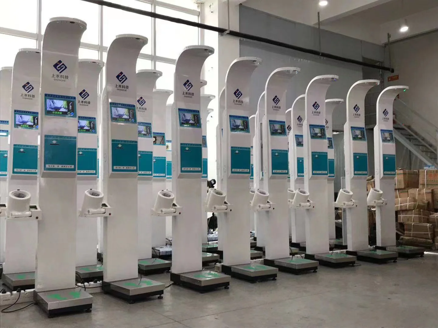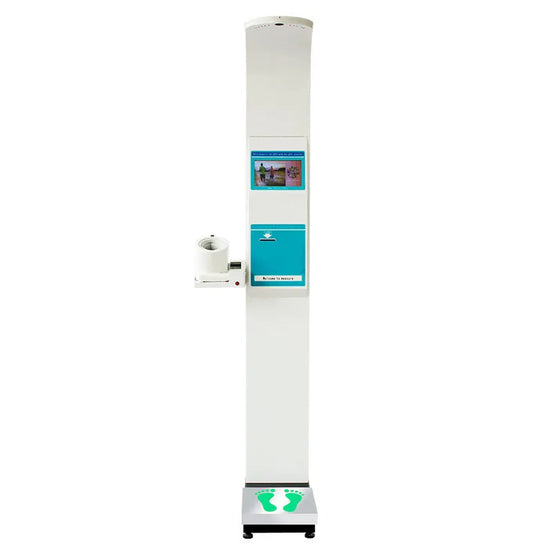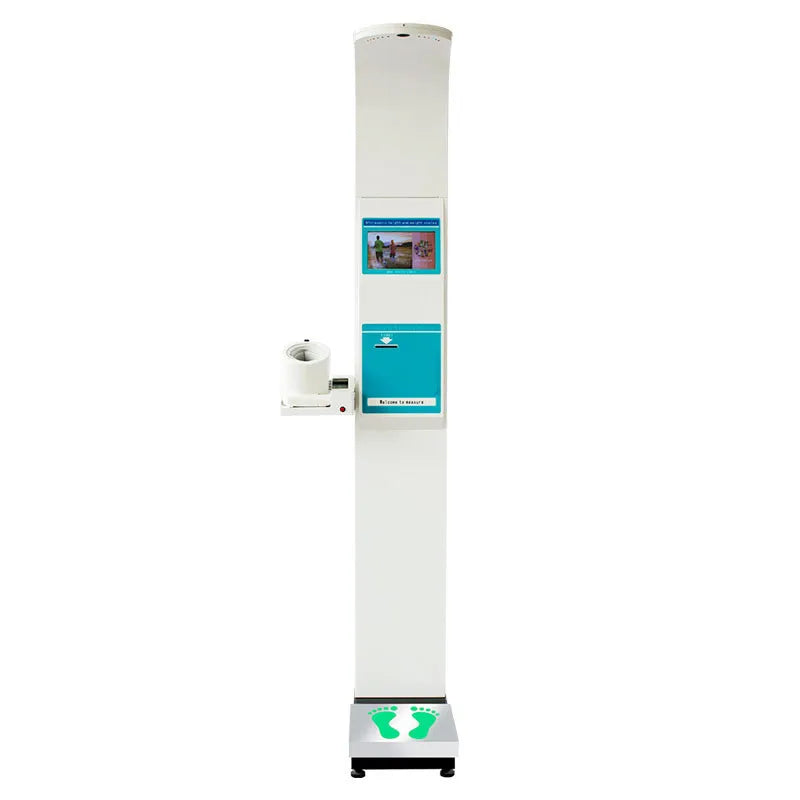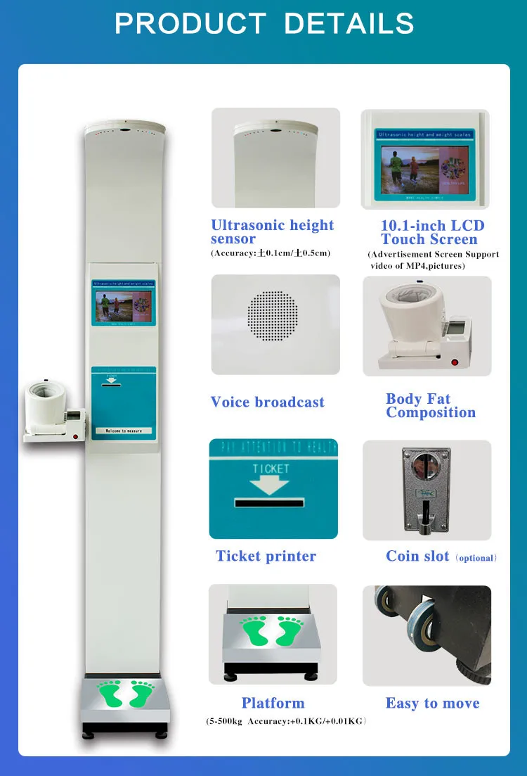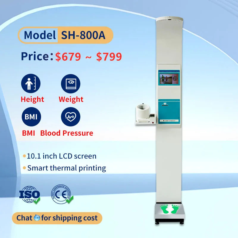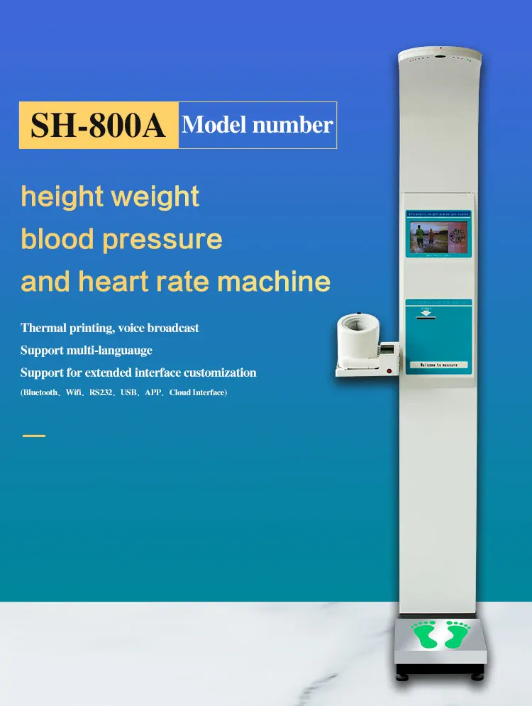SH-800A Height Weight Blood Pressure Scale Functions: 1.Ergonomic shape design 2.Fully automatic measurement of height and weight, automatic sensing system 3.Ultrasonic technology to measure height (temperature compensation) 4.Precision balance beam resistance strain sensor 5.Intelligent calculation of BMl 6.Automatic measurement of blood pressure (high pressure, low pressure), pulse (heart rate) 7.10.1-inch screen digital LCD display 8.Coin operated/paper money (optional) 9.High-speed thermal printing, automatic printing of measurement results 10.Displays indoor temperature and current time 11.Data transmission: RS232 serial port,WiFi (standard); Bluetooth/4G/RJ45/cloud interface (optional), etc. 12.It can be connected with a computer, and the results are transmitted to the customer's Software. 13.Supports multiple languages and can switch languages on the screen. 14.Expansion: face recognition, barcode/QR code, IC/ID card etc.
