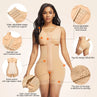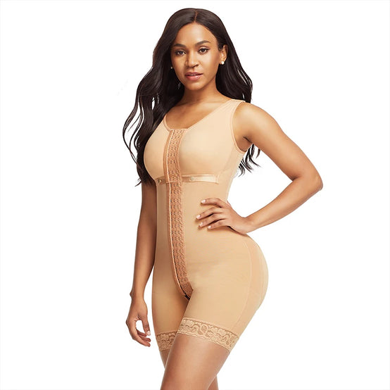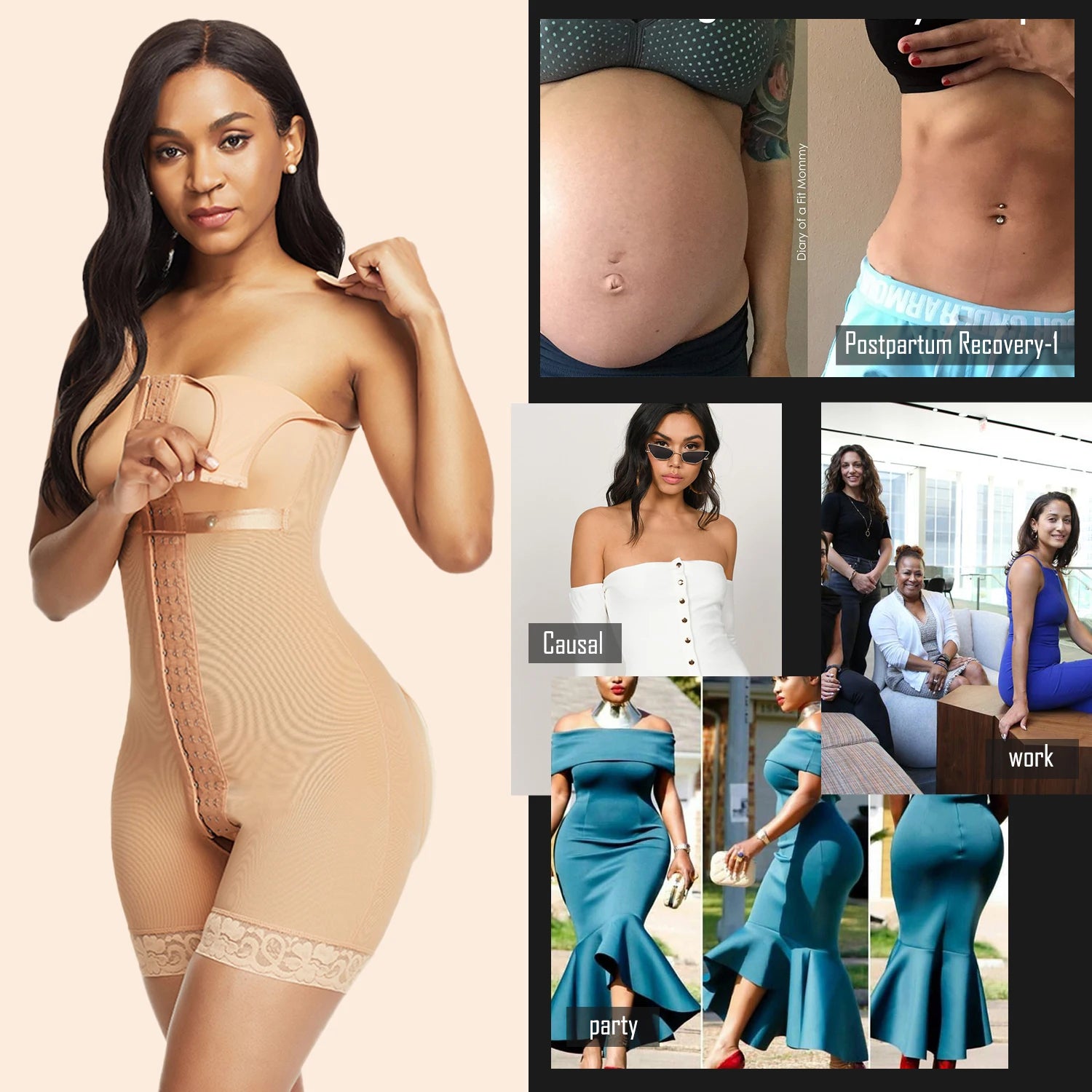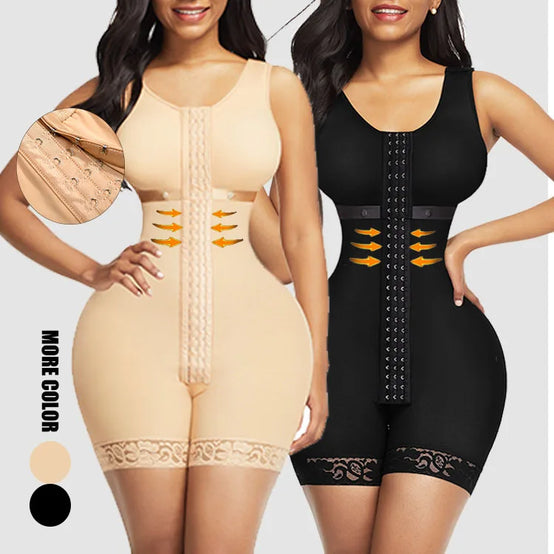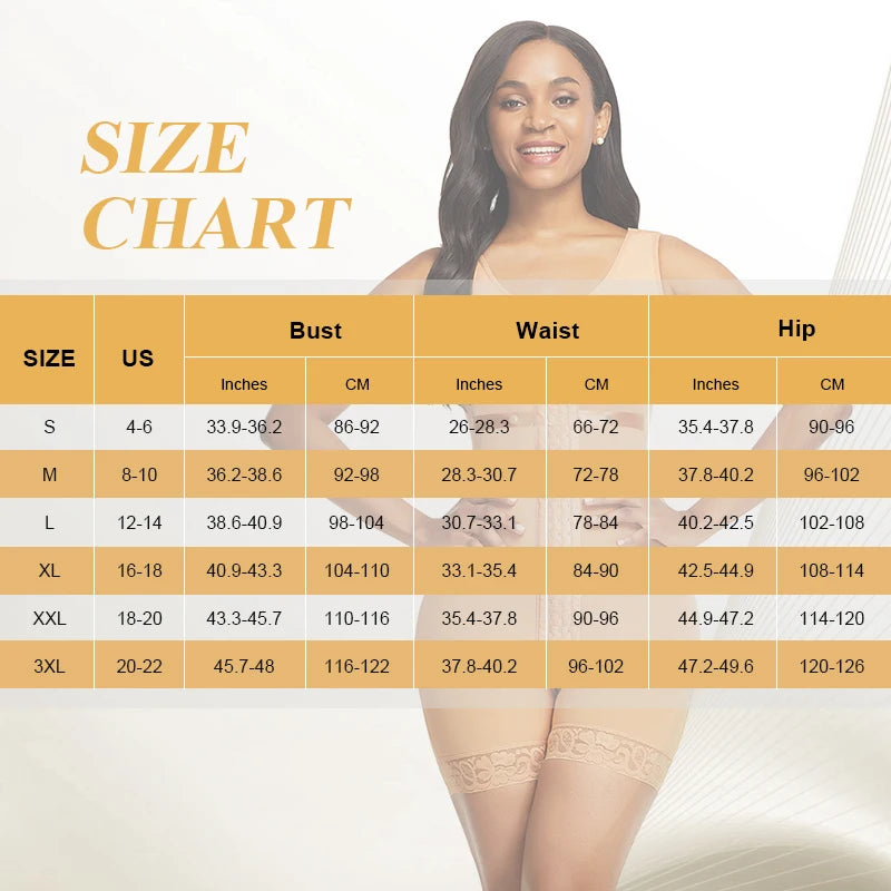 2. High elastic fabric at chest, lamination design, suitable for a variety of chest sizes; 3. 3-layer fabric design on abdomen for enhanced abdominal compression; 4. Open crotch design for easy bathroom access; 5. Dropping glue design at legs opening prevent rolling up; 6. Butt lifting design, enhances your own natural shape; 7. 3 eye and hook closure are adjustable for a great fit. |