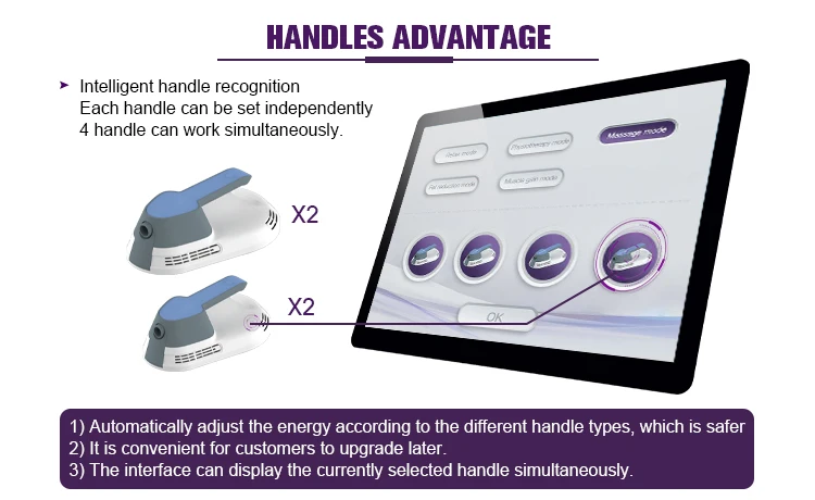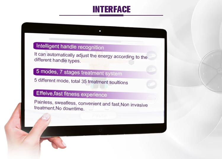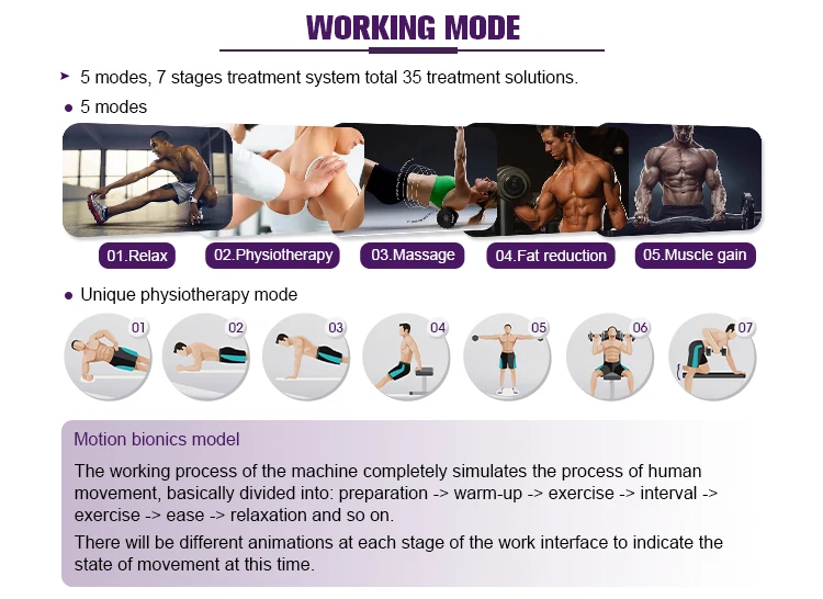 (1).Relax mode (2).Physiotherapy mode (3).Massage mode (4).Fat reduction mode (5).Muscle gain mode |