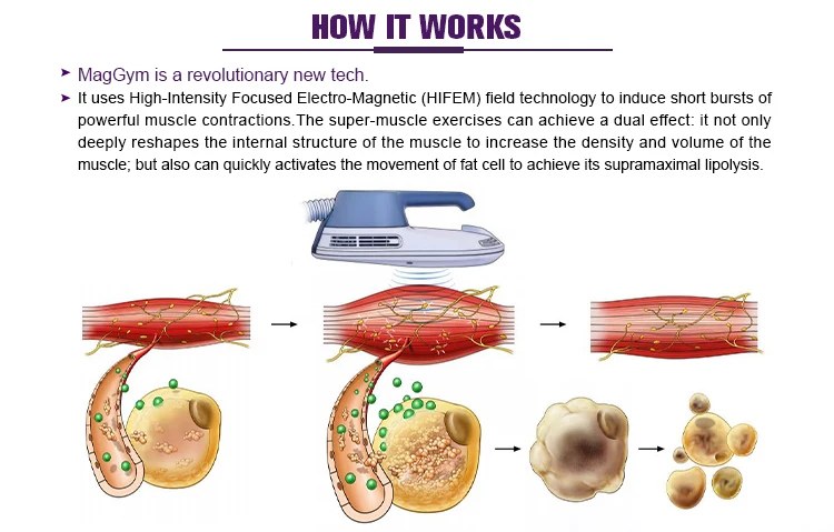 MagGym is a revolutionary new tech It uses High-Intensity Focused Electro-Magnetic field technology, it is not only deeply reshapes the internal structure of the muscle to increase the density and volume of the muscle; but also can quickly activates the movement of fat cell to achieve its supramaximal lipolysis.
