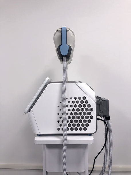 Using high-intensity focused electromagnetic field technology → stimulating nerves → continuous expansion and contraction of autologous muscles → extreme training → deep remodeling of muscles → growth of myofibrils (muscle enlargement) → production of new collagen chains and muscle fibers (muscle hyperplasia) → thereby training and increasing muscle density and volume