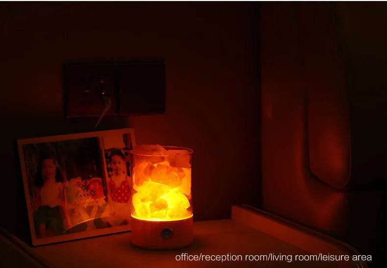 WT-M4 crystal salt lamp uses natural crystal salt ore. The salt crystal can generate negative ions and emit ions to the surroundings. It has an ion production process. After the salt lamp is lit, a large amount of negative ions can be quickly released by heating, which can effectively improve the air quality. The negative ions released can effectively purify the air. Moreover, the unique natural orange-pink light waves of the salt crystals help to relieve stress, relax the body and mind, and relieve fatigue. At the same time, the product has a built-in color light mode, which can purify the air and also create a comfortable space environment. It uses the heating tube inside the product to generate heat and transmit it to the salt crystal for heating, so that it can effectively release negative ions. At the same time, through the light of the color LED lamp, it creates a comfortable atmosphere effect.Suitable for scenes such as living room and bedroom.