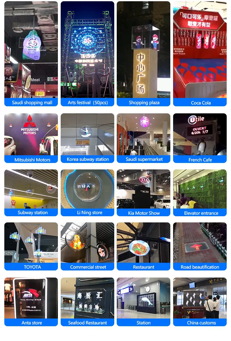 1.Amazing 3D display effect, eye catching for all the application. 2.High resolution ensure the ads quality. 3.Audio function can be wireless connection with the speaker. 4.Cloud function can be workable for long distance control. 5.Big range of sizes offer, and Support splicing technology can fit all the customers needs.