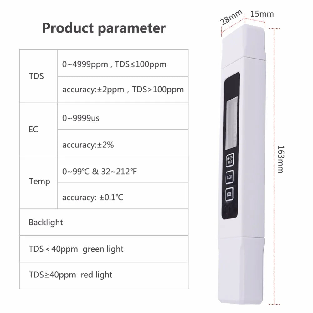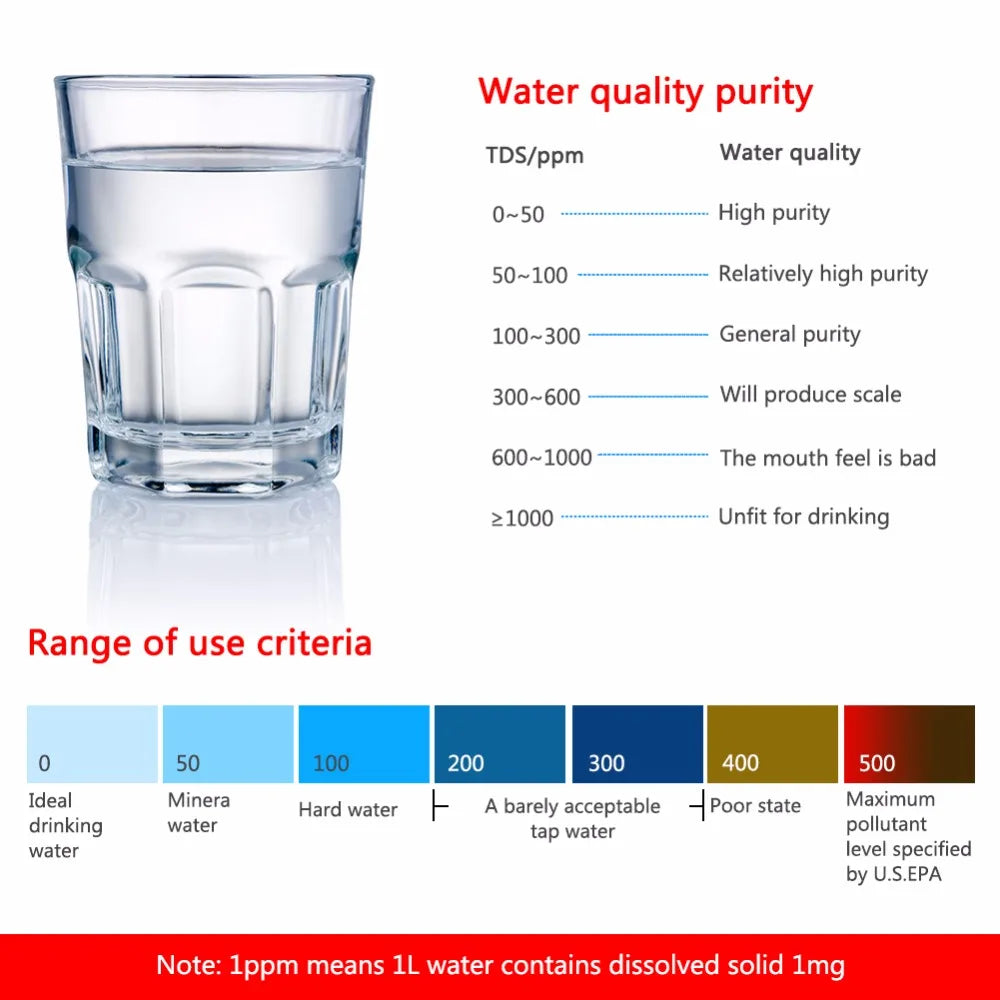 - Backlight:green (direct drinking water) TDS≤40ppm