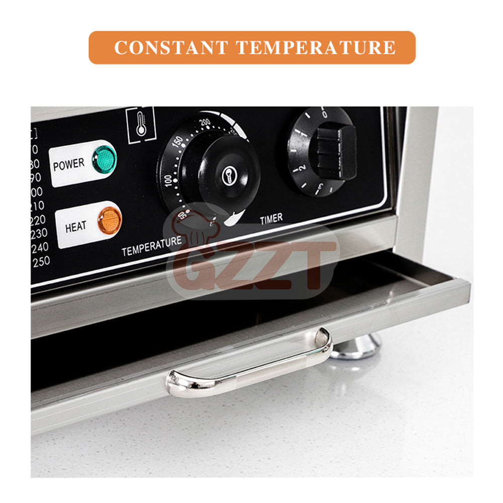 1. Stainless steel body--durable and sturdy, easy to clean. 2. Non-stick coating baking pan--fast heating, easy operation. 3. Temperature control--50-300℃ of precise control. 4. Set the timer(0-5min) to properly control the heating time.