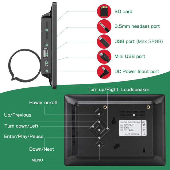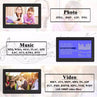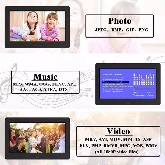 The digital photo frame with high performance for its superior design,material selection and technology. It supports for playing a variety of photos, audio, video,calendar and clock to make sure all your gorgeous memories will be presented in a diverse and vivid way.You can put it in the living room, bedroom and anywhere you like. You can also give it as a gift to your friends, family or lovers.
