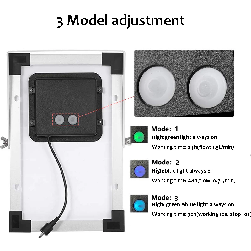 Low Power Mode (small amount of bubbles): Blue Indicator On, working hour 48h, Flow 0.7L/min