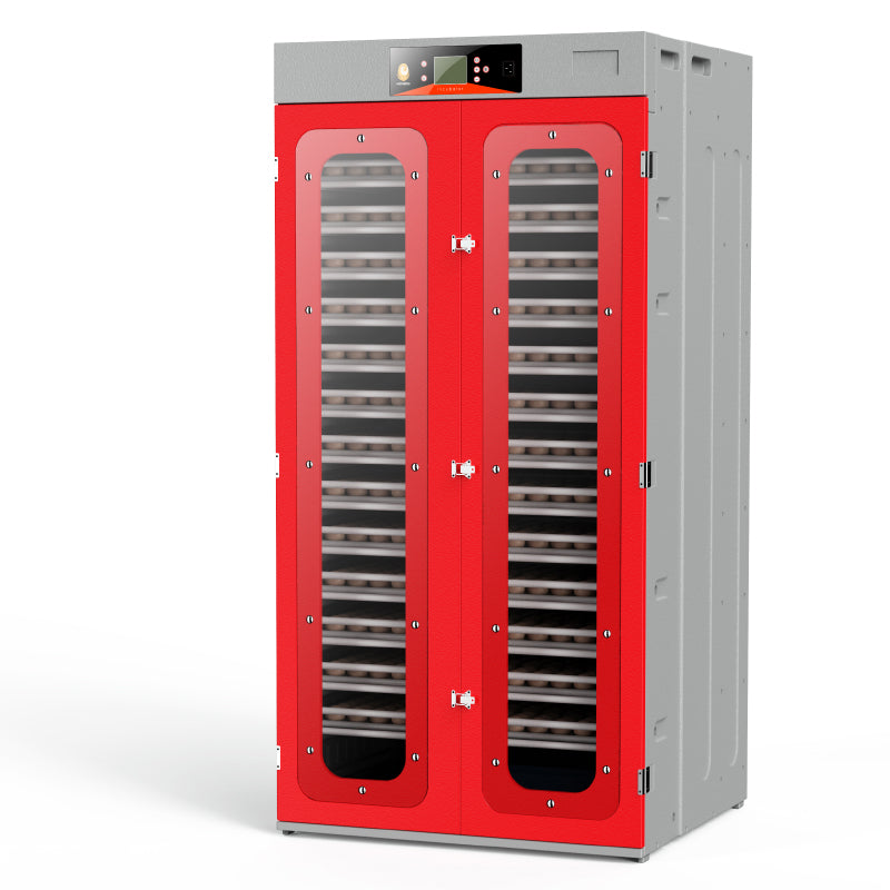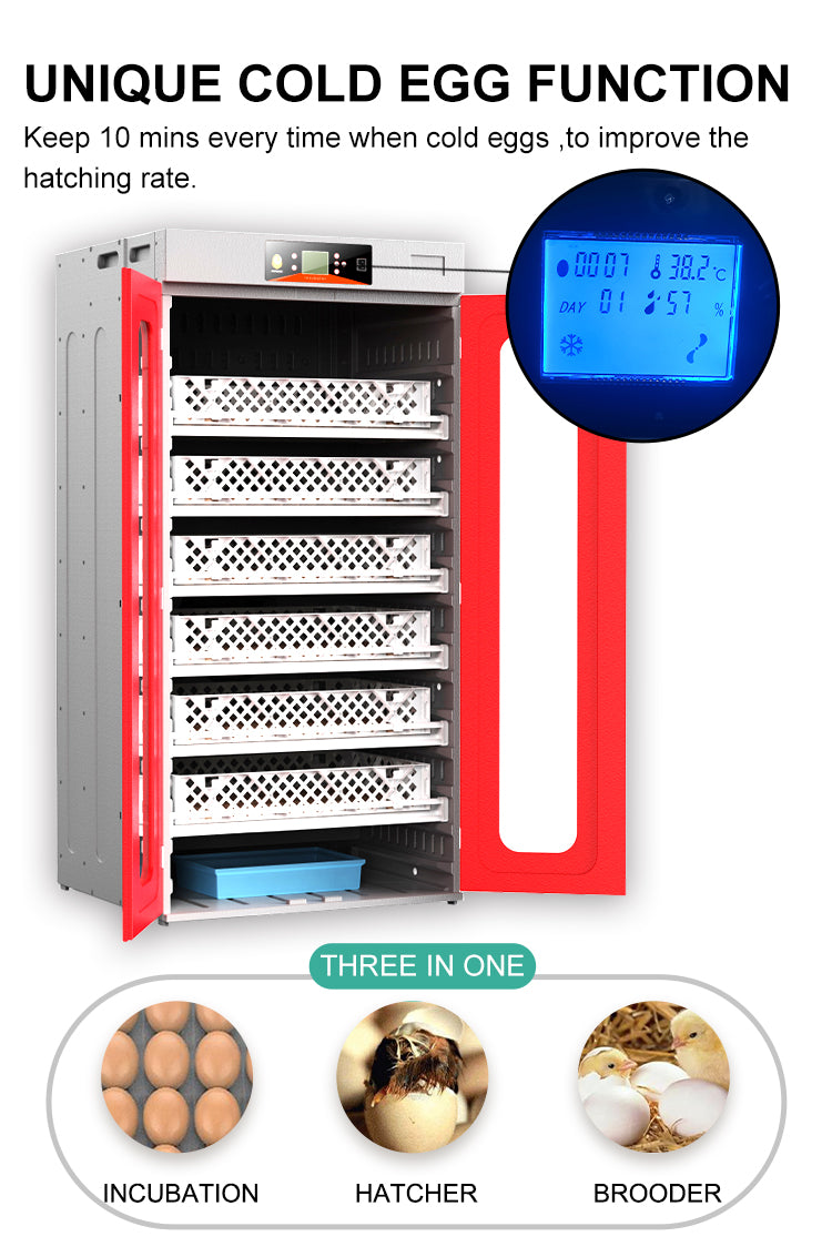 3.Mainbody with Double-layer hollow design,More uniform,accurate and stable temperature control. 4. Independent heating system,4 pcs Silicone heating wire built-in, increased the surface area of the radiator,if one damage does not affect others heating work. 5. Automatica egg turning,simulate the original ecological hen hatching mode. 6. Automatic temperature control and digital displaycurrent temperature and humidity. 7.Double-layers 2 Large transparent visible observation window doors,Convenience incubation design. 8.Automatic humidity control by automatic high-pressure spray.Easy to control humidity,Durable quality Translucent water tank adds water inside and outside at the same time, the external water evaporates naturally, and the internal water adopts automatic high-pressure spray. 9. Effective Ventilation design,with 4 air inlets and 4 air outlets for ventilation design to improve the internal better air quality. 10.Hatcher and setter are combined 11.Strongest and durable package by 5-layers carton box. 12.Drawer type design rolling egg tray,easy to put egg for hatching 13.Rolling egg tray suitable for hatching various eggs. 14.Whole Copper material fan,long lifespan,More uniform temperature control.