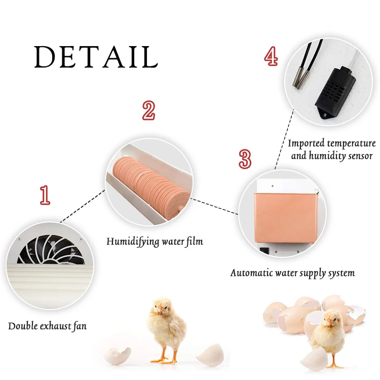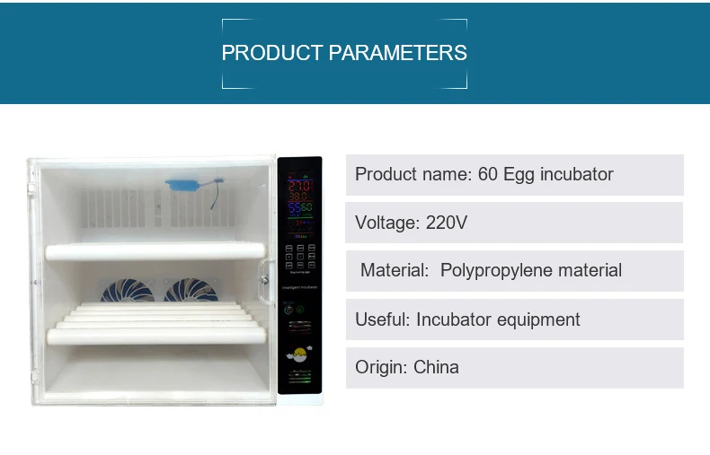 1.Automatic temperature control, variable capacity, adjustable shaft spacing, unlimited breeding eggs, roller turning egg structure, ABS material hatching basket 2.Incubation, hatching, brooding 3.Circulating wind structure to solve the uneven temperature inside the machine 4.The overall frame is strong and durable. The product plate is made of PP plastic which has strong corrosion resistance 5.Roller egg tray, suitable for a variety of egg types, independent gears and not easy to damage, long service life 6.Dual power supply can be connected to 12v battery(battery not include)