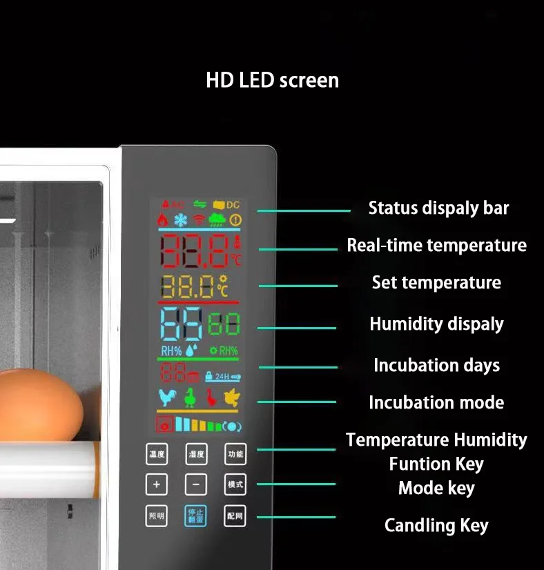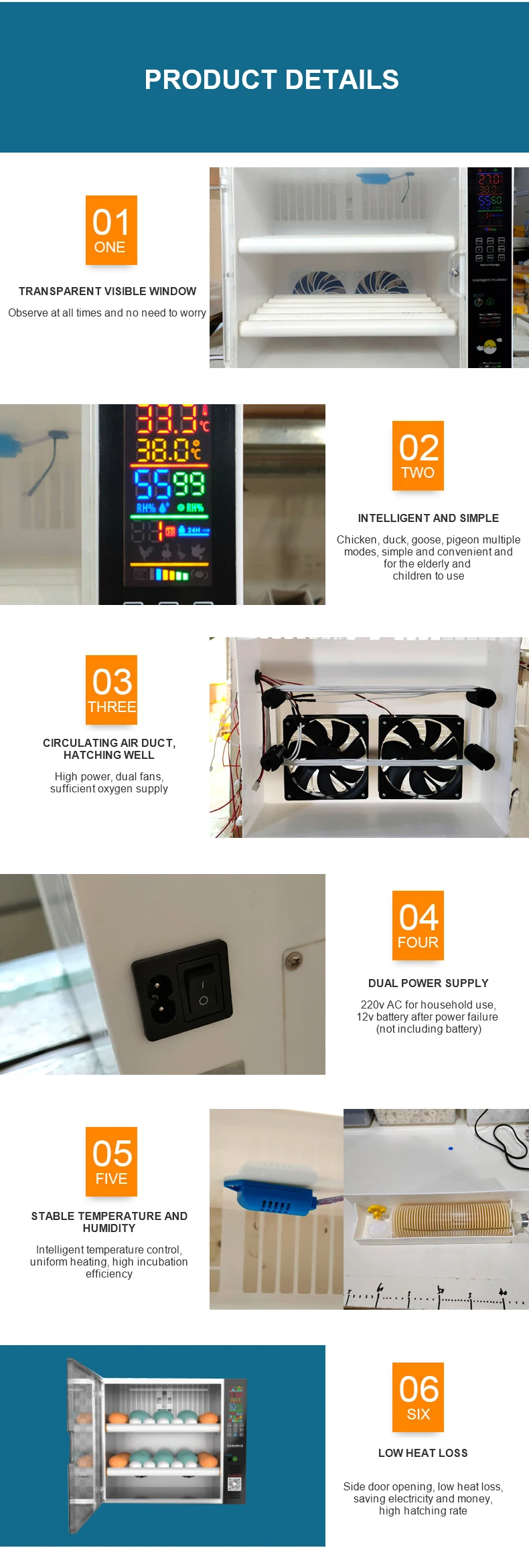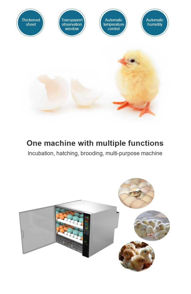 1.Durable and higher quality egg incubator 2.One machine both incubation and hatching together, saving money and more economi 3.Automatic egg incubator with roller egg tray and adjustment the distance of egg tray makes operation more interesting and more easy to operation 4.One-key incubation, simple operation, chicken, duck, goose, pigeon, constant temperature 5 hatching modes 5.Support kinds of plug : EUR ,USA ,UK PLUG