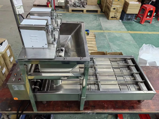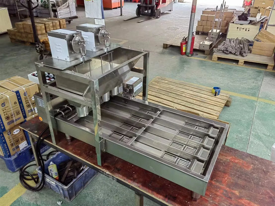 This is four rows production ring shape donut making machine, including donut shaping and frying. The hourly capacity could reach to 1900-7600 pieces. Donut size is adjustable (30-100mm size).Each drop of production makes four pieces of donut. Auto dropping, auto turn over for frying and auto discharging out of machine after cooked.