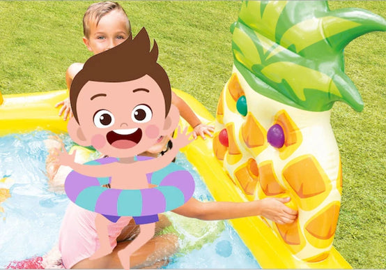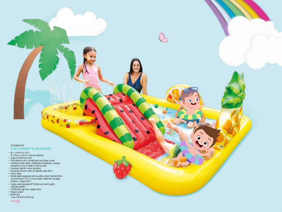 Includes water slide, inflatable pineapple, orange, strawberry and 6 balls to fit the wall. (And Repair Patch)