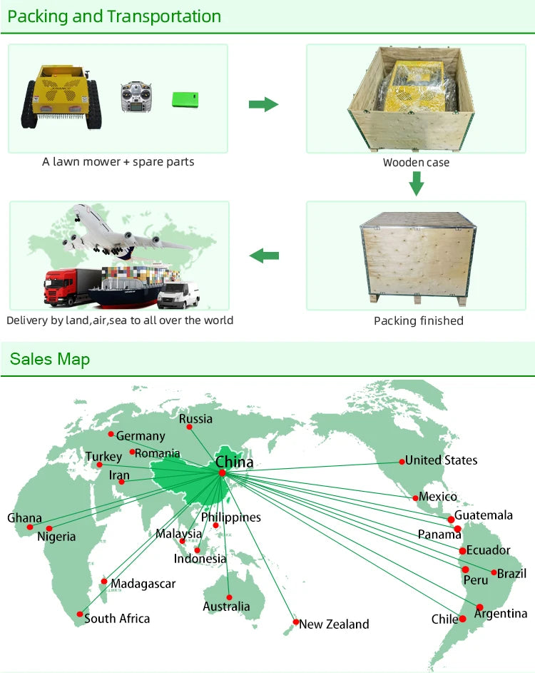 Travel Speed is up to 6 km/h. Remote controlled lawn mower is 16 times more efficient than hand cutting. Wo