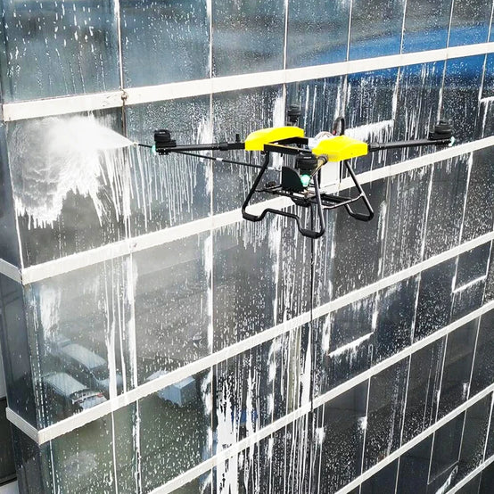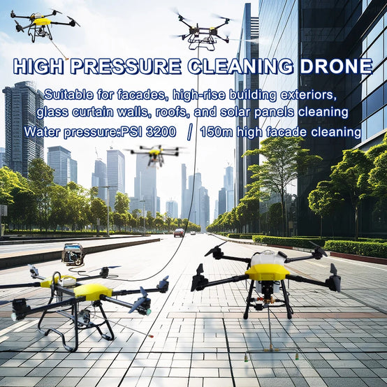 This drone is designed for glass façade and exterior cleaning of buildings up to 40–60 floors high (approx. 150–200 meters). Actual performance depends on wind conditions and water pressure setup.