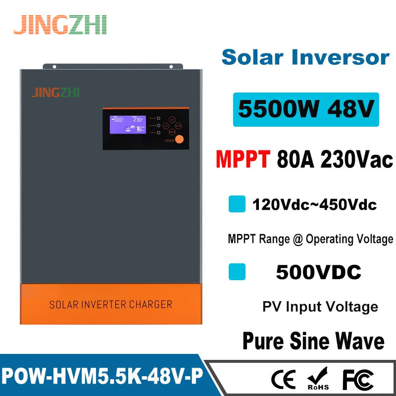 JZ Power Smart Inverter 5.5KW 5.5KVA MPPT 80A 500VDC PV Input 230VAC 48V with/no Parallel 5500W to 3 Phase Hybrid Solar Inverter