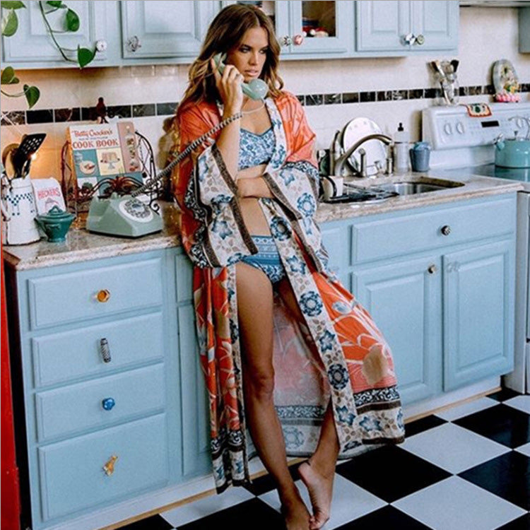 Kimono Beach 2021 Floral Print Long Cardigan Summer Women Wear Bikini Wrap Beach Kimono Cover Up Dress
