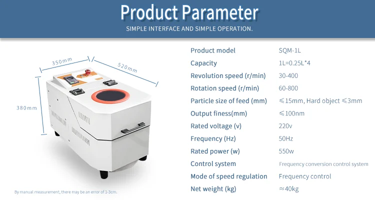 1. SQM-1L oil-sealed planetary ball mill is an essential device for mixing, fine grinding, sample preparation, nano-material dispersion, new product development and small batch production of high-tech materials. This product is small in size, full in function, high in efficiency and low in noise. It is an ideal equipment for scientific research institutions, universities and enterprise laboratories to obtain micro-particle research samples (four samples can be obtained at the same time in each experiment). With the vacuum ball milling tank, the samples can be ground under vacuum.