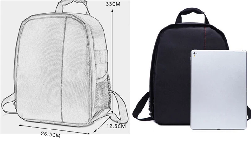 With our new DSLR backpack, all your equipment can now be stowed safely, cushioned, compact and reliable. A sudden rain shower? No problem! The backpack is waterproof, so you do not have to worry about your expensive equipment. Keep your gear safe and dry with our comfortable and sturdy camera backpack. All your items are stored securely in padded sections to protect them from vibration, damage and moisture. With our backpack the next trip is secured. Comfortable wearing comfort guaranteed! Features: waterproof Padded Available in different versions Pleasant wearing comfort Elegant and comfortable backpack - compatible with most DSLR cameras. Adjustable, padded dividers allow you to customize the compartments. External net pocket for accessories or water bottle. Internal mesh pockets for additional memory cards and other accessories. Comfortable, soft feel and shoulder straps with padded straps make sure you feel comfortable even on the longest journey. Double zipper for easy and quick access. Product size: 33 x 26.5 x 12.5cm Note: Manual measurement will cause measurement error of about 1-2cm (0.4-0.8"). It is water resistant to an extent, please avoid put it into the water or stay in rainstorm for a long time. Package included: 1x small size camera bag *other accessories are not incldued |